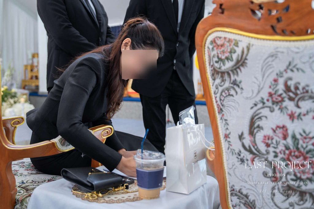 In this moment, the younger brother steps in to help review the list of names for those participating in the robe-offering ceremony during the cremation. It’s a small but meaningful gesture that highlights the family’s teamwork and dedication to ensuring everything is handled with care and accuracy. Getting the names right not only shows attention to detail — it’s also a sign of sincere respect toward the guests.