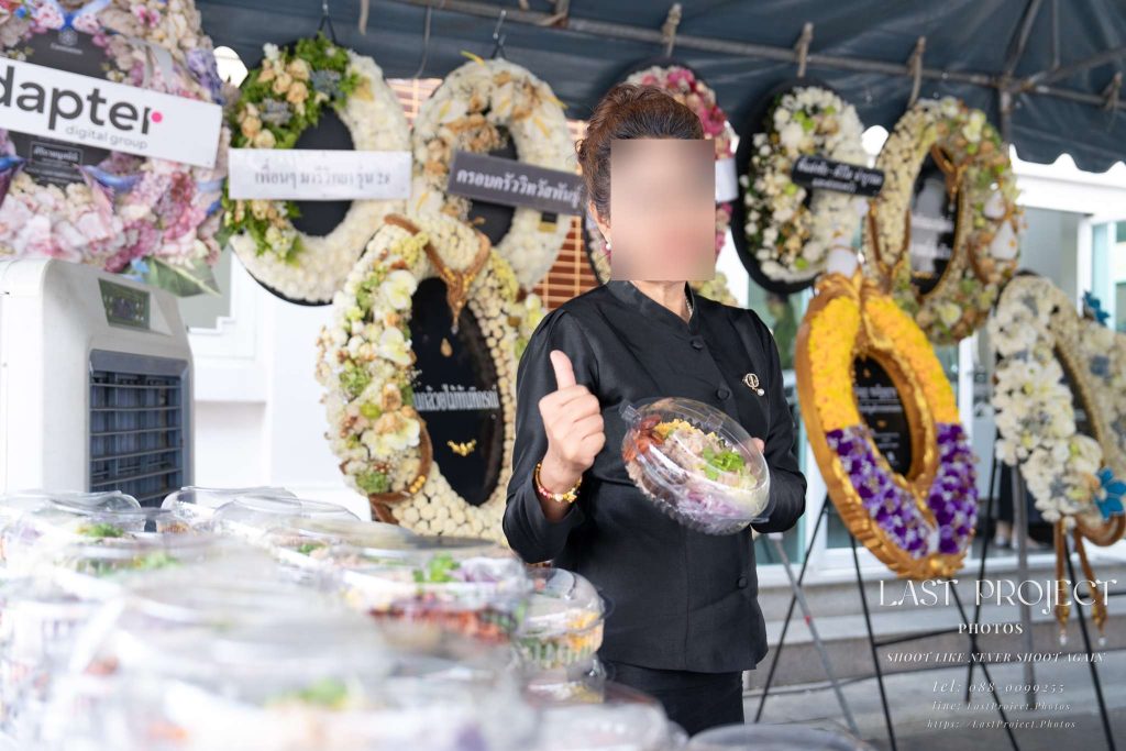 In this photo, the host proudly showcases the boxed meals prepared for the guests — delicious, well-known dishes that reflect the family’s heartfelt hospitality. It’s a meaningful way to express gratitude and care toward those who came to pay their respects. The photographer composed the image with intention: using the food in the foreground and funeral wreaths in the background, capturing both the spirit of remembrance and the warmth of thoughtful hosting.