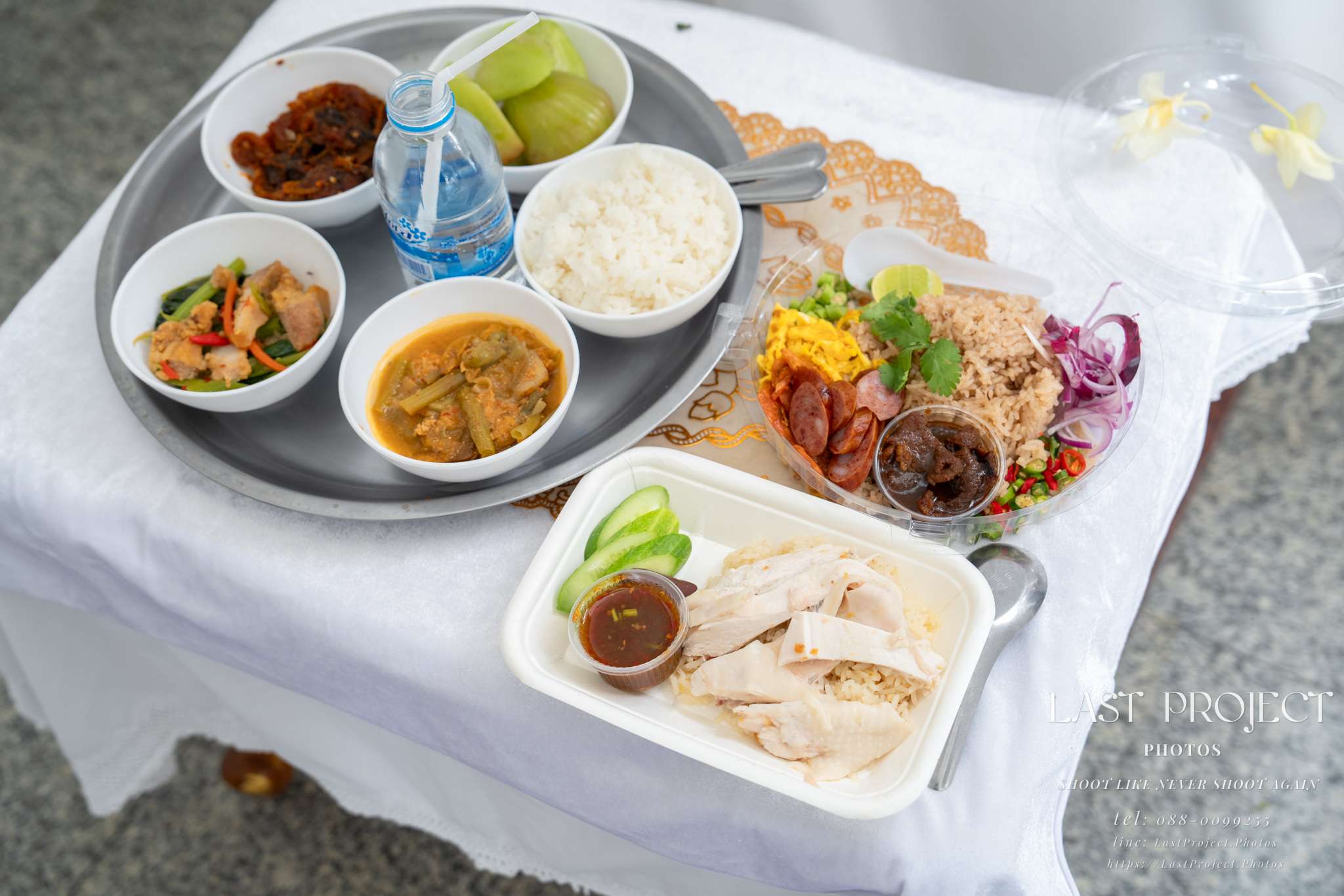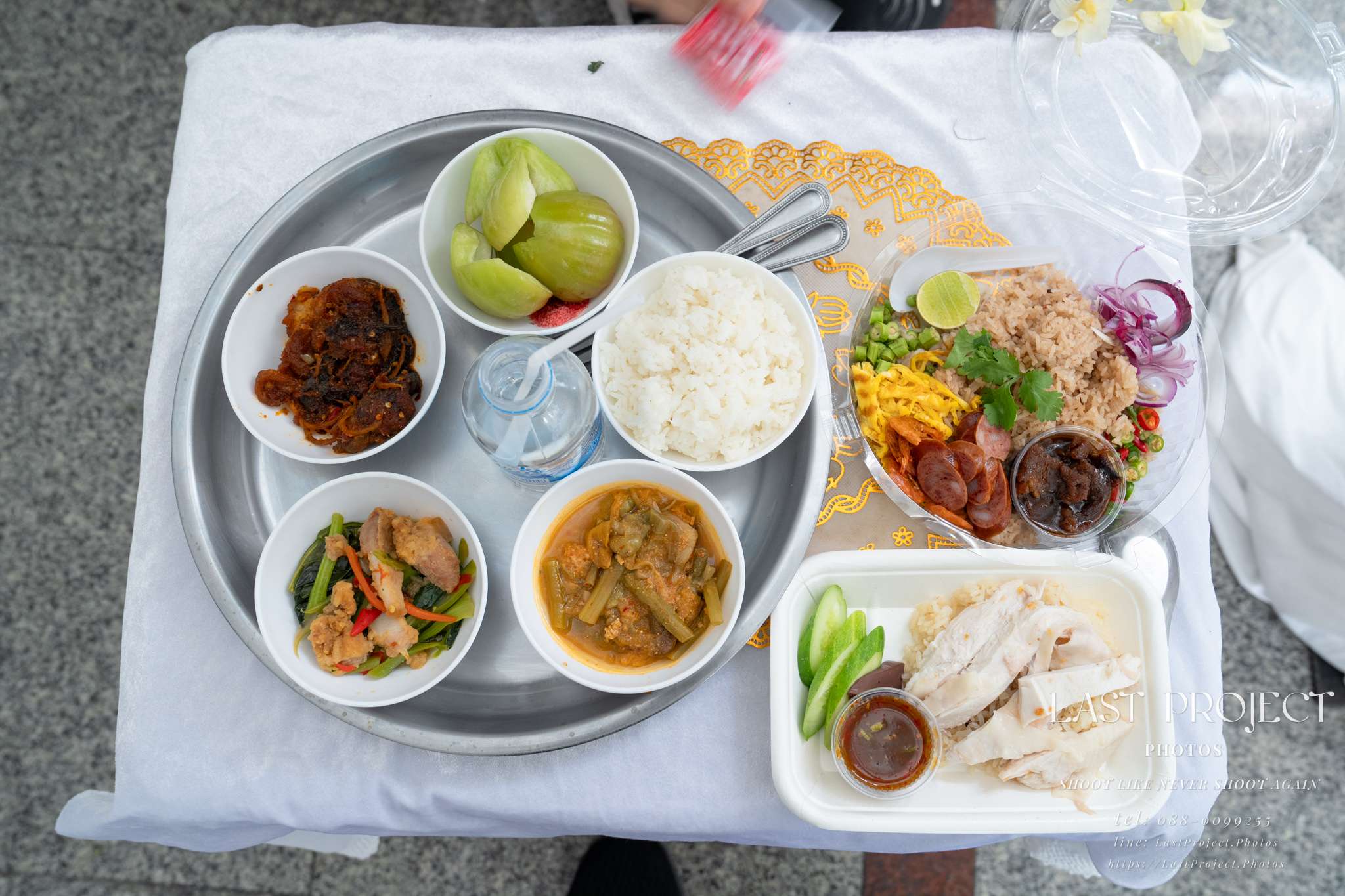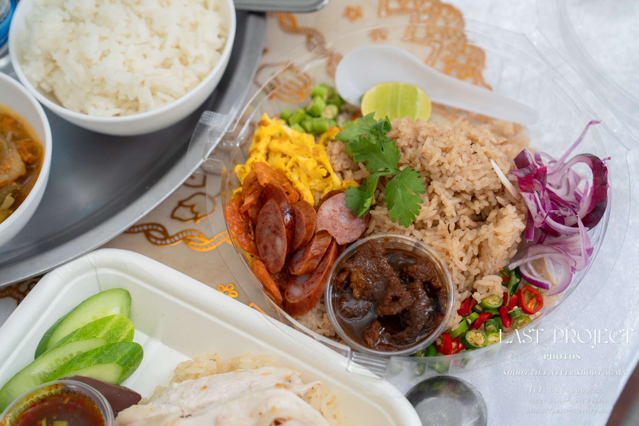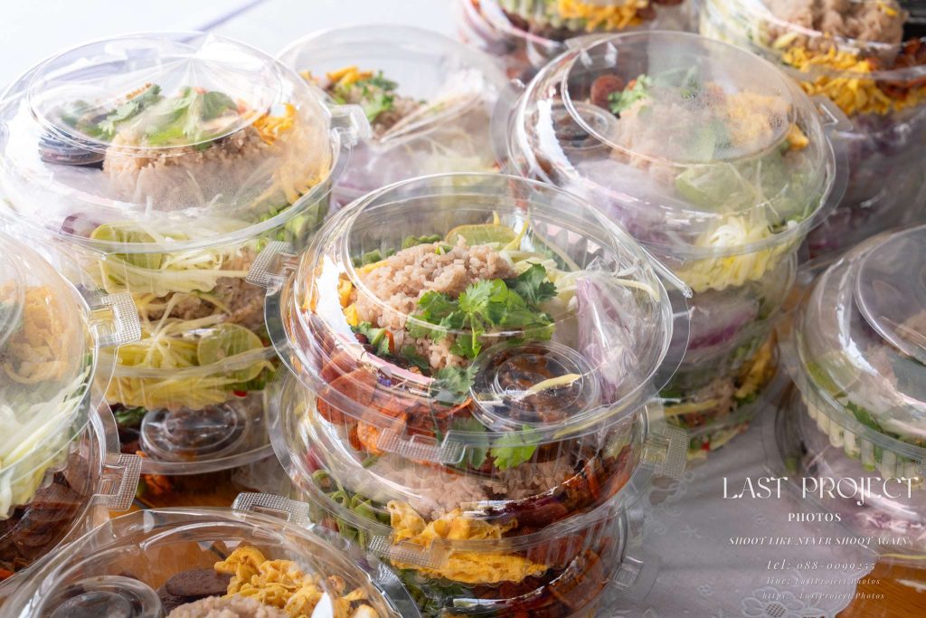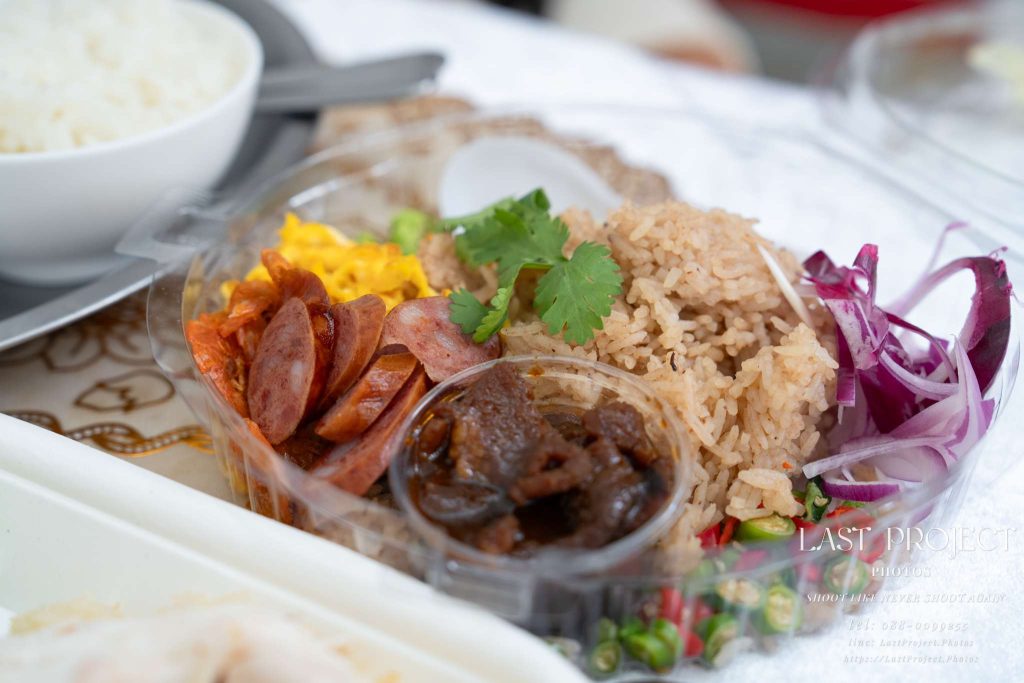Khao Kluk Kapi (Shrimp Paste Fried Rice) is a single dish that comes with multiple flavorful sides in one box. In this photo, the funeral photographer has captured all of its elements, including: