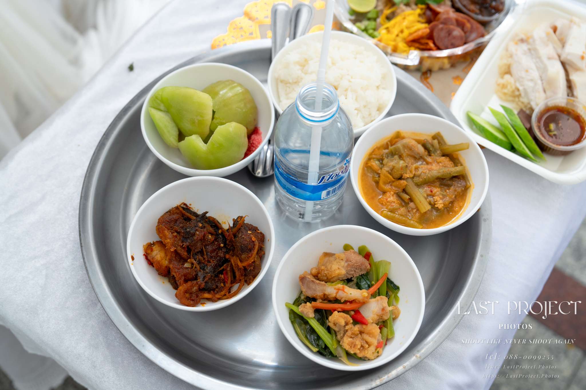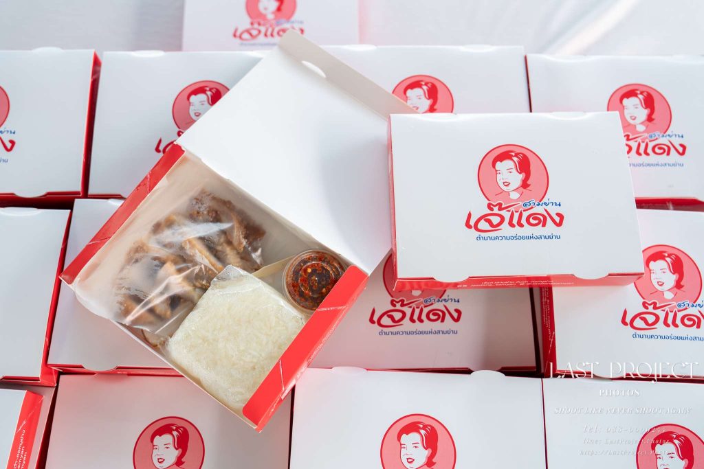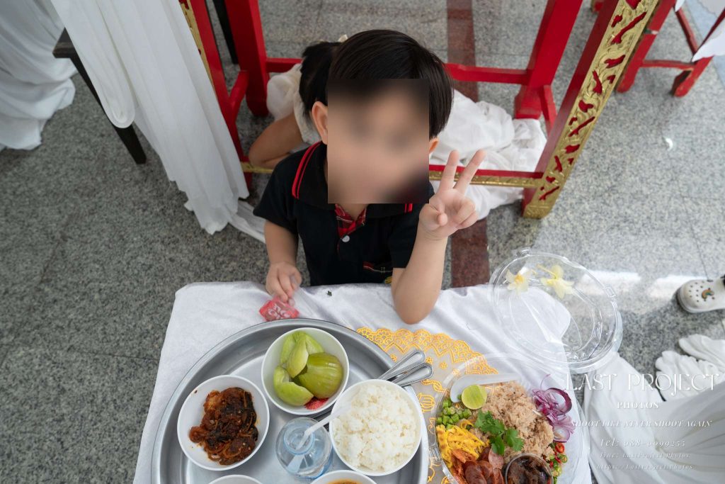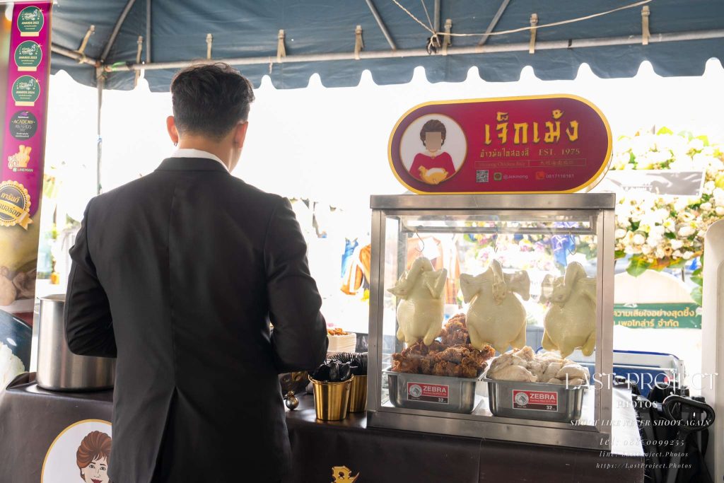 Today’s refreshment for funeral guests was a famous and well-loved dish: sticky rice with crispy fried pork from “Jae Daeng,” a renowned local vendor. The photographer captured this scene thoughtfully, showing both the branding on the box and the contents inside. This image highlights the host’s care and attention to detail, ensuring that every guest was treated to something delicious — a small but meaningful gesture that added warmth to the occasion.