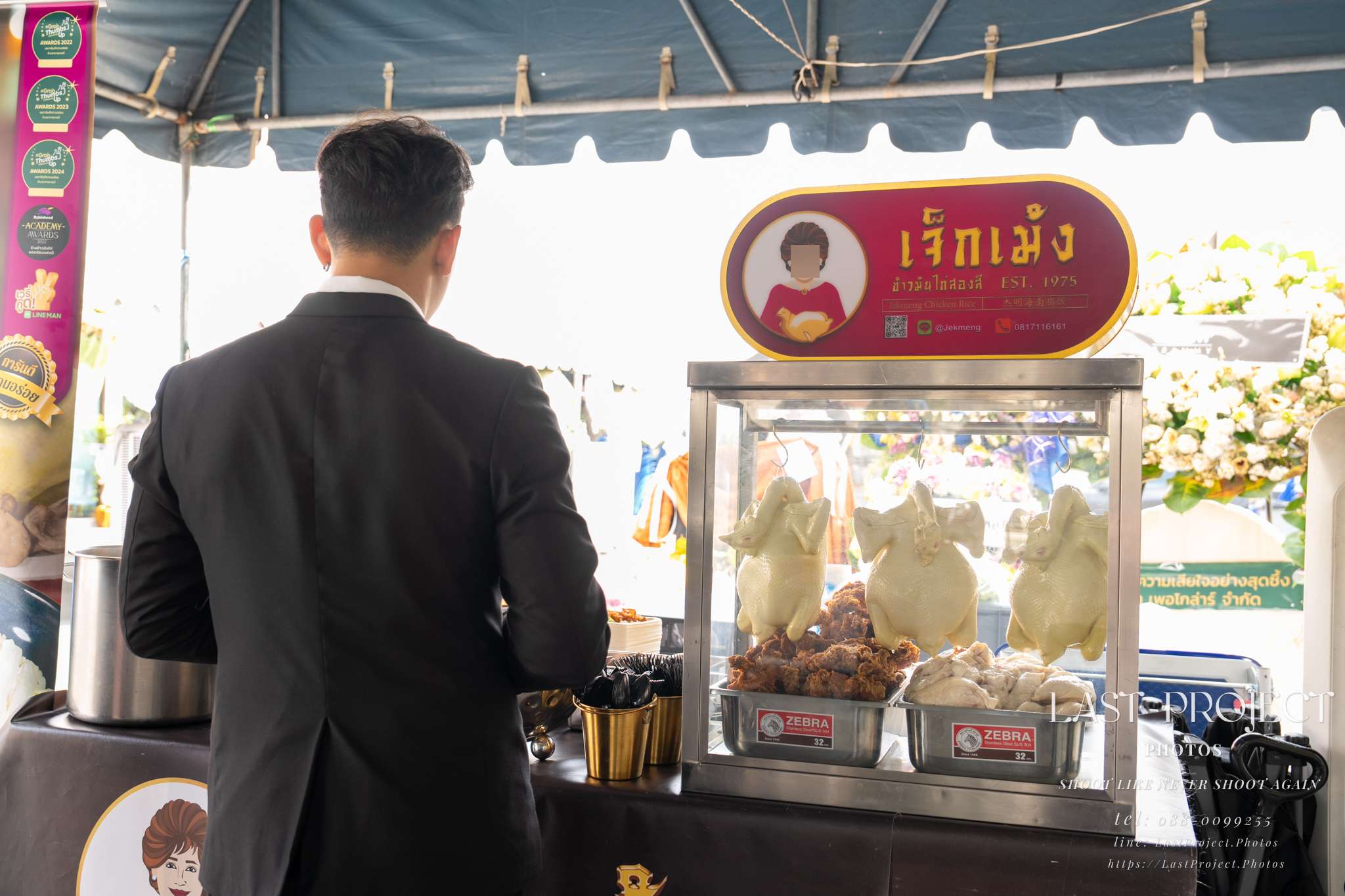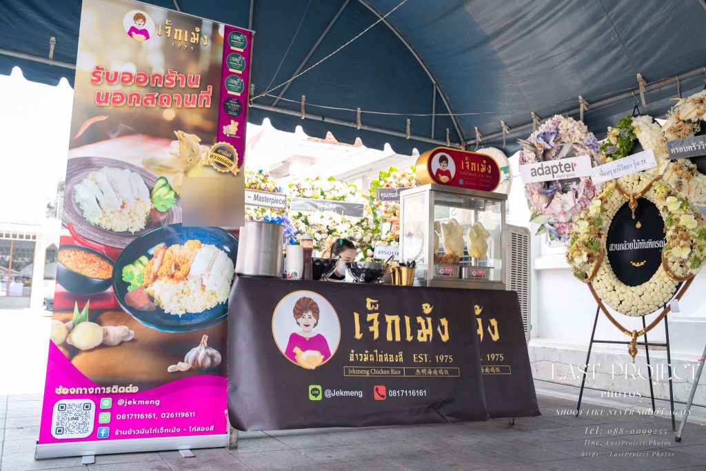 This photo is taken from the opposite side of the food stall, showing a large cardboard cutout of the vendor promoting their “legendary grilled pork” alongside the popular shrimp paste fried rice. These dishes were selected by the host family to offer variety and delicious options for guests, reflecting thoughtful planning and care in hosting the funeral service.
