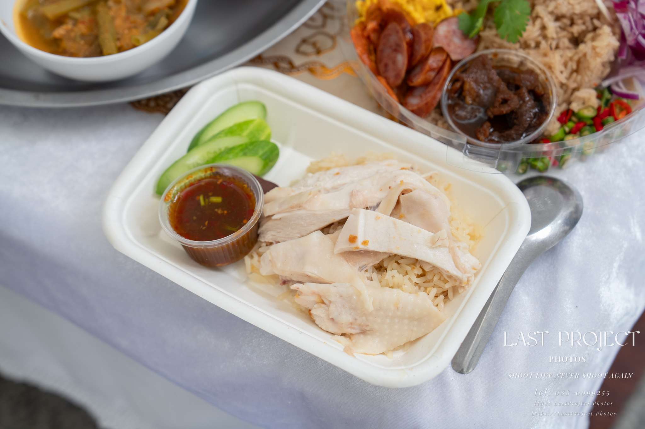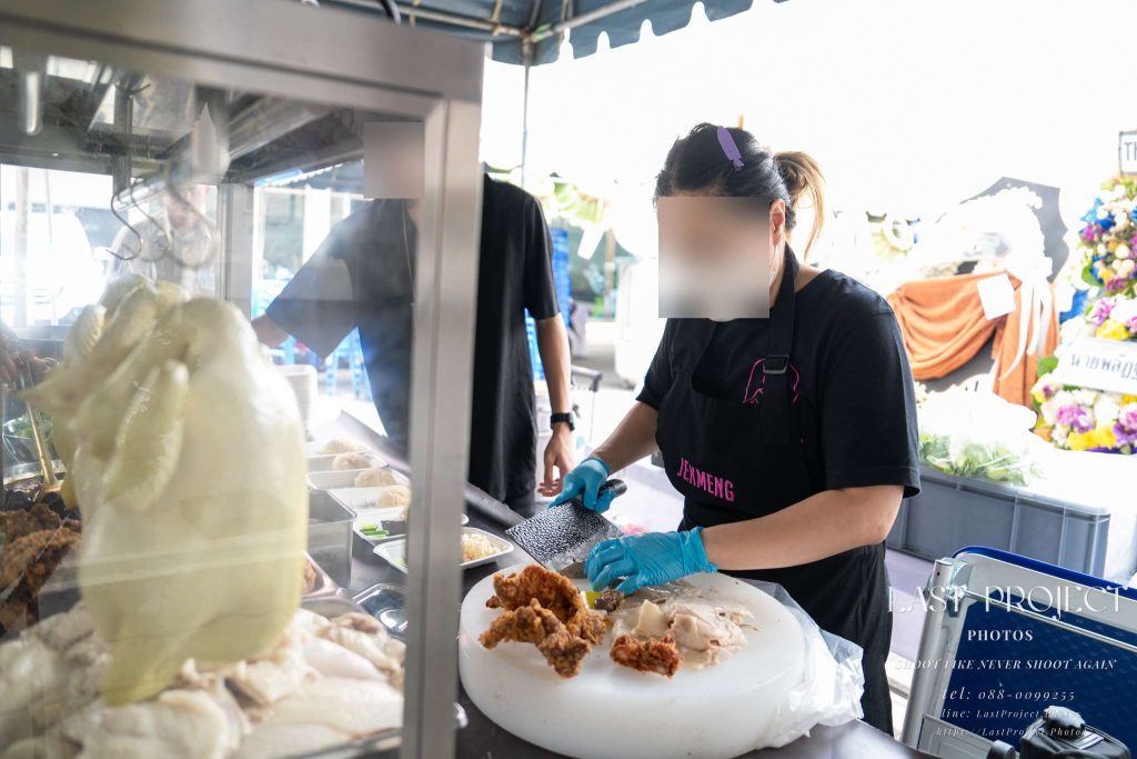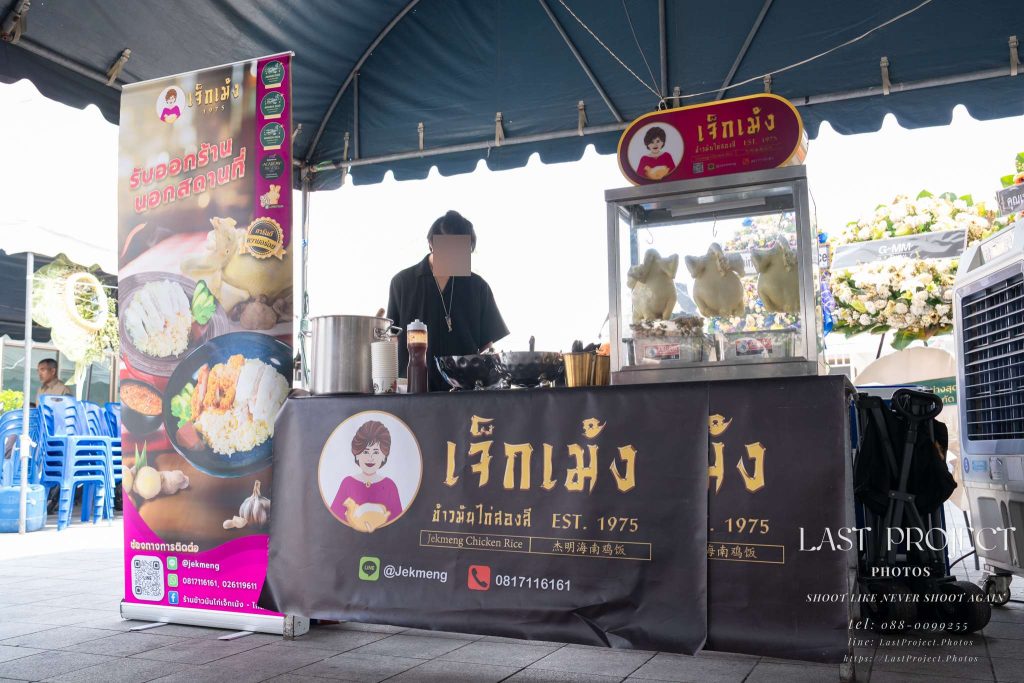 This photo captures the setup of “chicken rice” — a well-known Hainanese chicken rice vendor hired by the host family to serve guests at the funeral. The image reflects the host’s thoughtfulness in choosing quality food, and the photographer made sure to document this as part of the complete story of the memorial event.