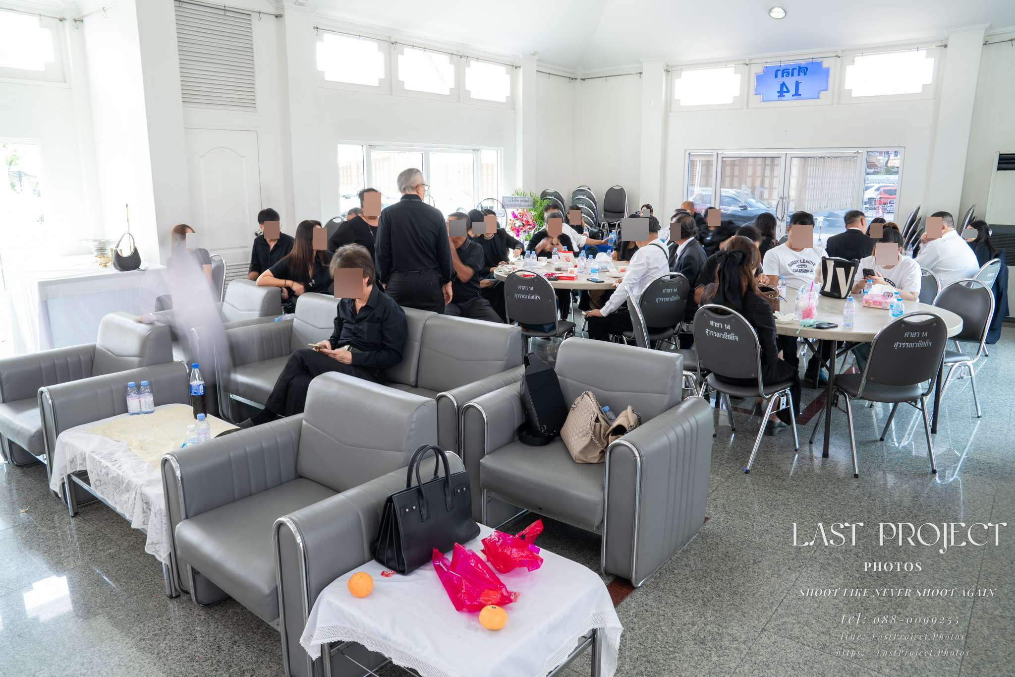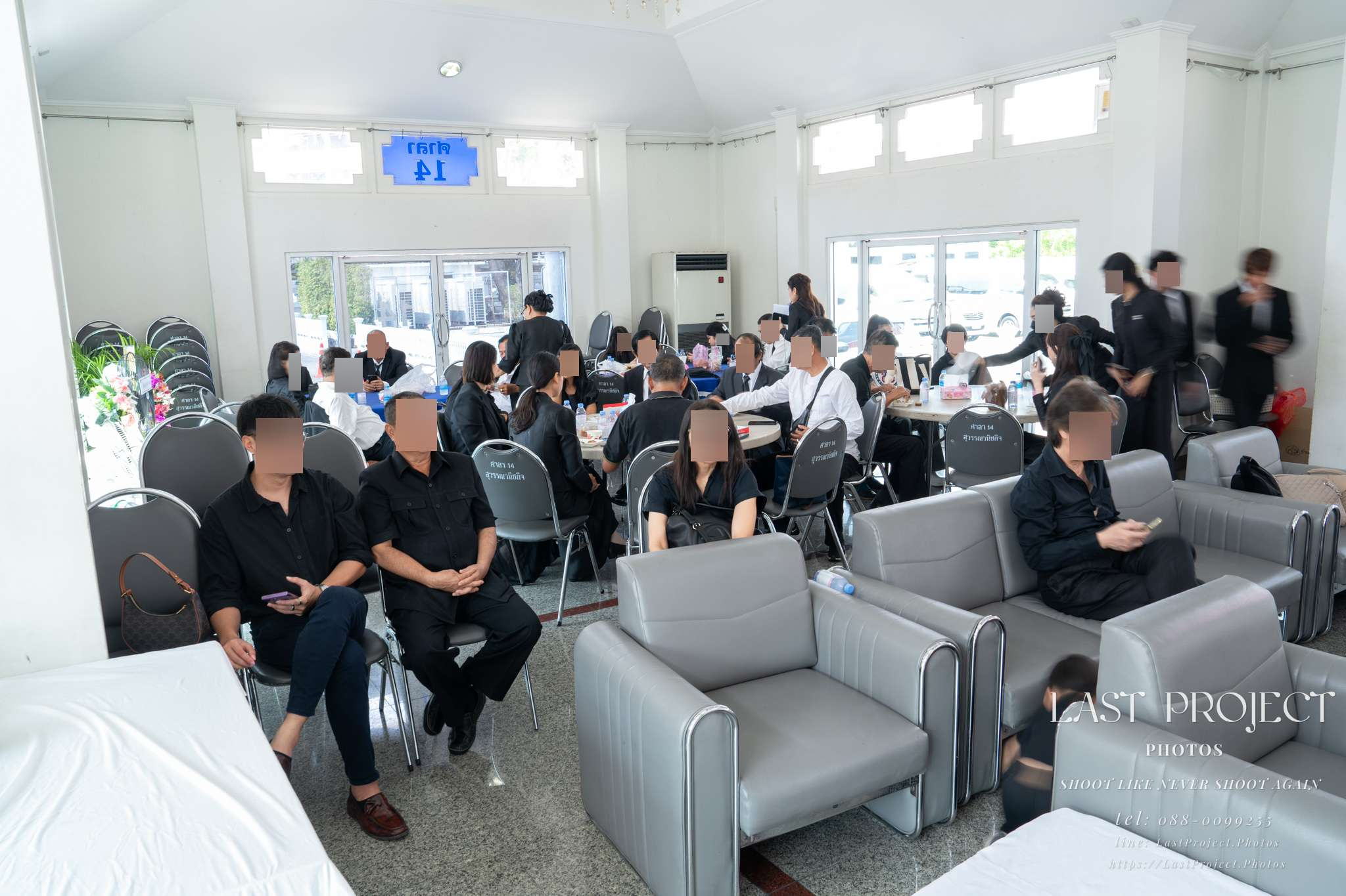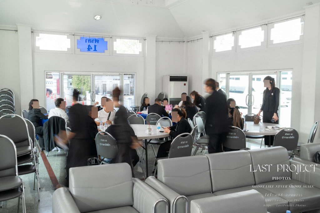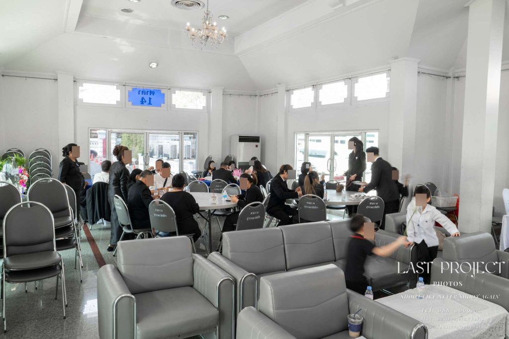 After finishing the food photography, the photographer captured the atmosphere inside the funeral pavilion as more guests gradually arrived — conveying a sense of solemnity and respect during the memorial ceremony.