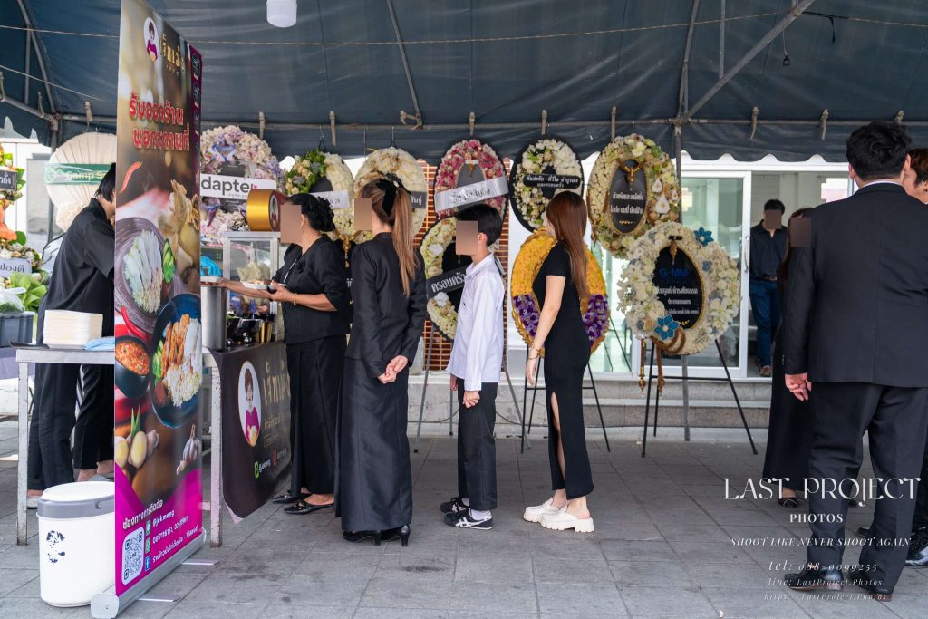 During the time the funeral photographer was capturing images of the food placed in front of the casket, new guests arrived. The family requested a photo near the floral wreaths outside the ceremonial hall. The photographer quickly switched focus to capture portraits first, then returned to the food photography to ensure no important moment was missed.