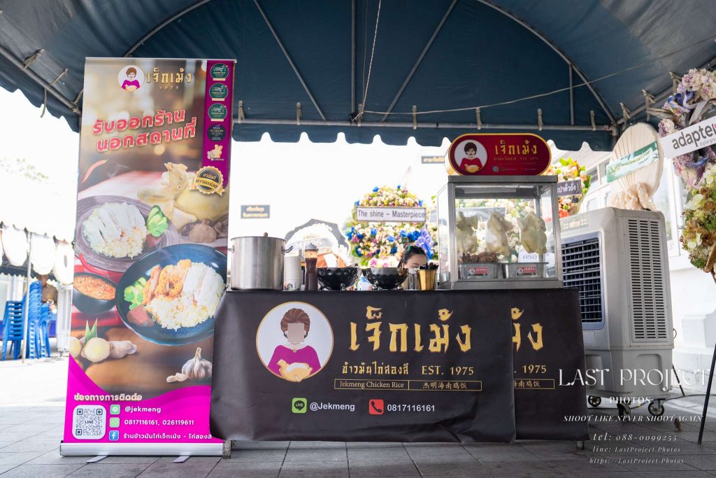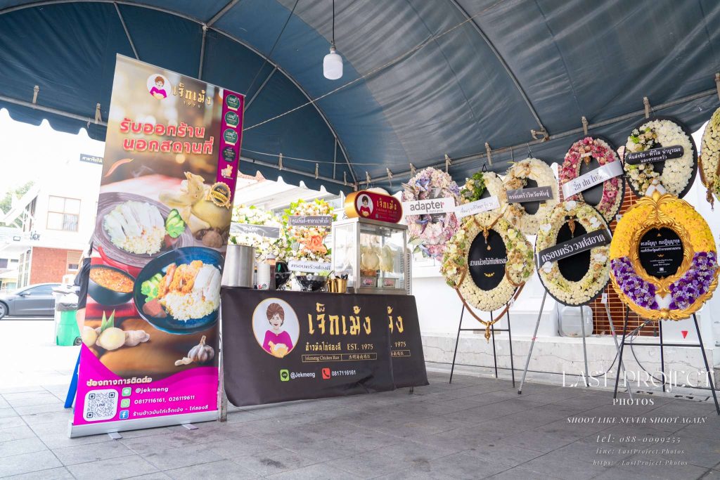 This image is taken with a closer zoom to highlight the details of the booth a famous chicken rice vendor selected by the host family to cater the funeral. The shop’s branding, menu visuals, and surrounding atmosphere are clearly visible, showcasing the host’s attention to detail in organizing the memorial service.