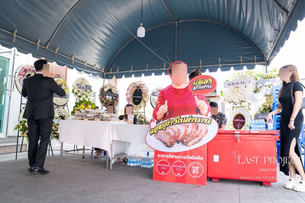 A life-size cutout of the famous grilled pork shop was placed at the catering area of the funeral ceremony, letting guests know the meal came from a reputable vendor. The funeral photographer captured this detail to document the full atmosphere of the event.