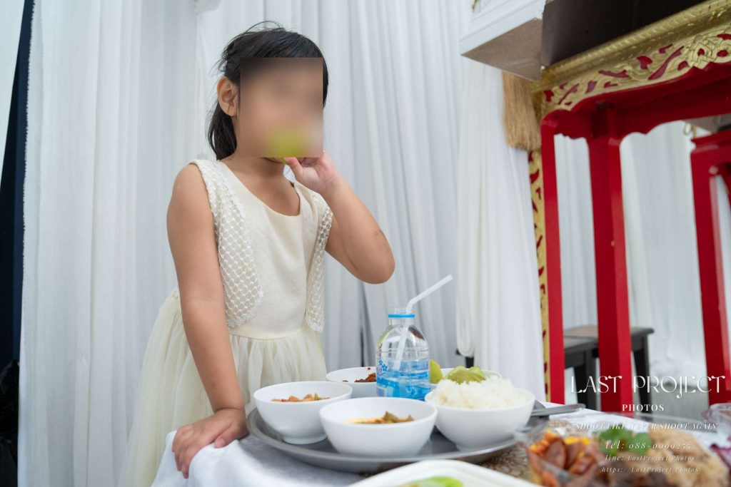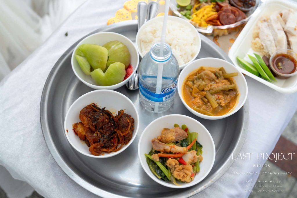 The food placed in front of the casket is the same as what was served to the guests. It is offered as a traditional gesture of merit-making for the deceased. The meal is carefully arranged, clean, and identical to those served to attendees—reflecting the host’s respect and thoughtful planning for a dignified funeral ceremony.