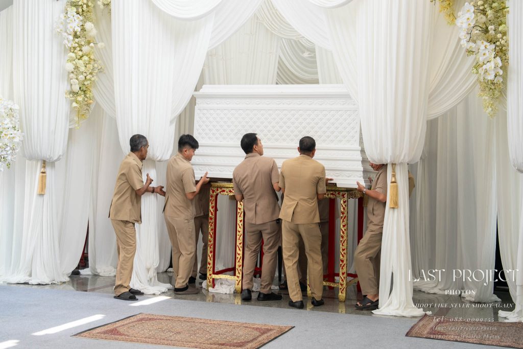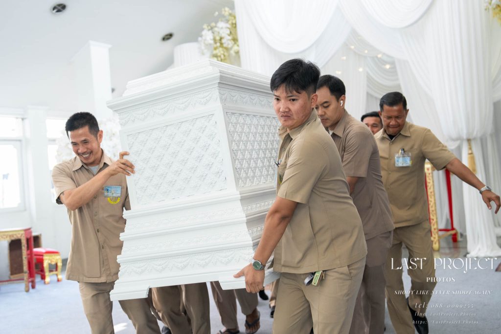 The photographer patiently waited a little longer to capture the full cremation procession within the frame, ensuring that guests following behind the coffin were also included. This thoughtful composition highlights the collective reverence of everyone present and preserves a deeply meaningful memory.