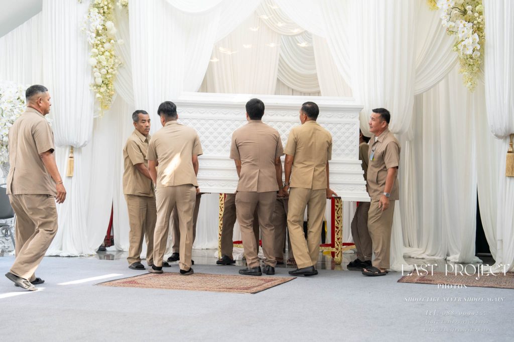 The photographer quickly moved to the front of the pavilion to capture this pivotal moment as the staff carried the coffin out, preparing for the cremation procession. The image conveys movement, unity, and the solemnity of the final farewell.