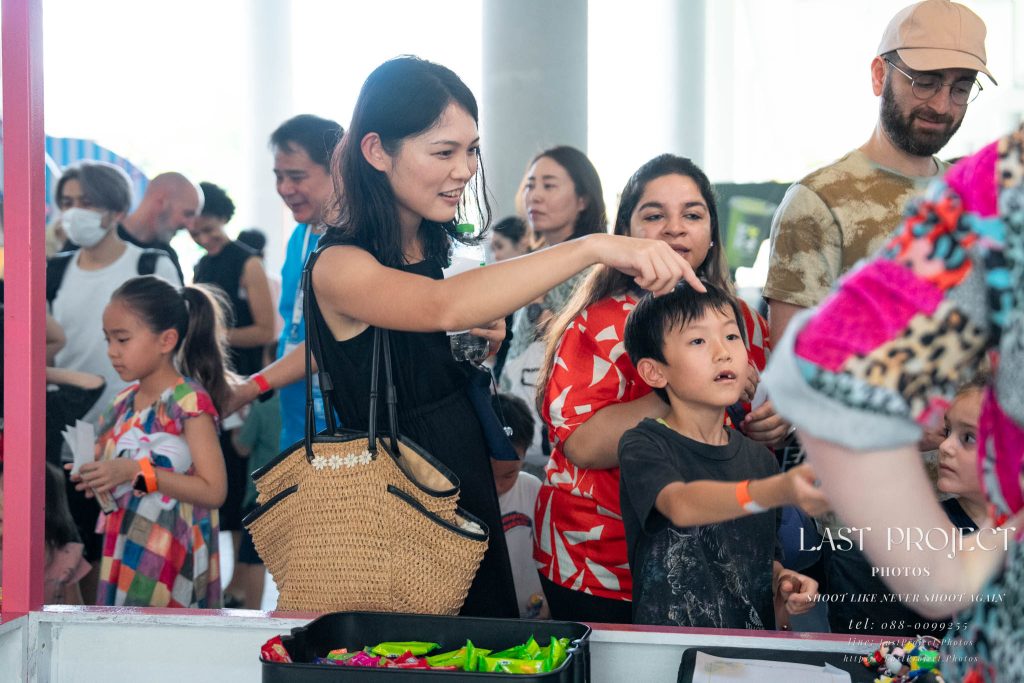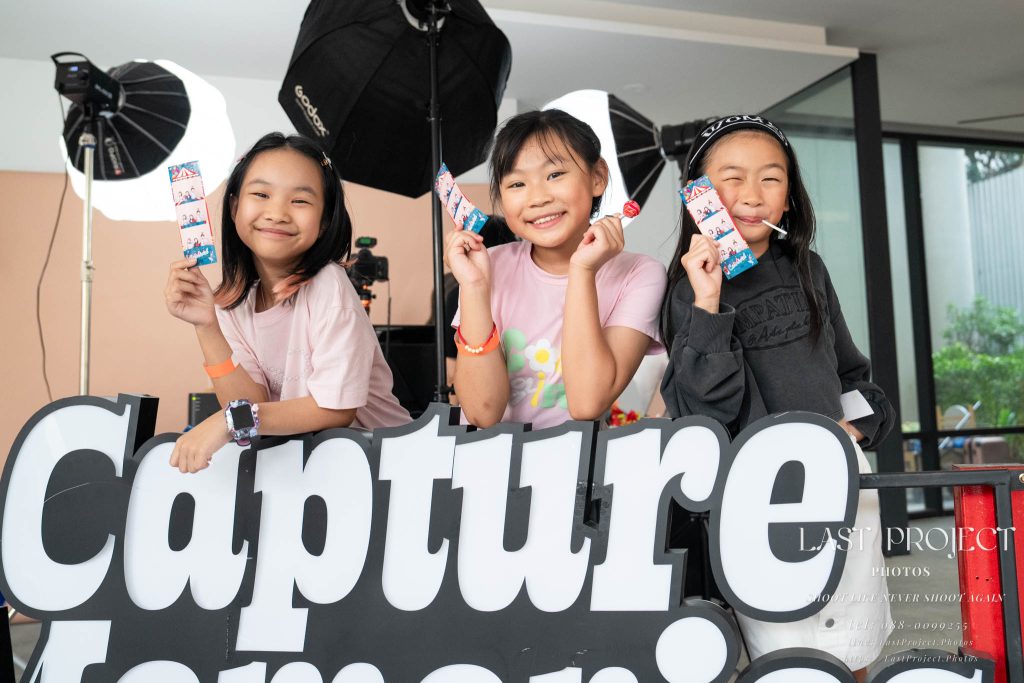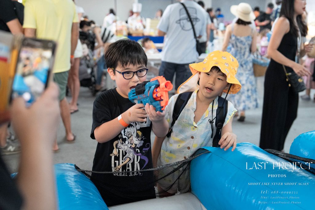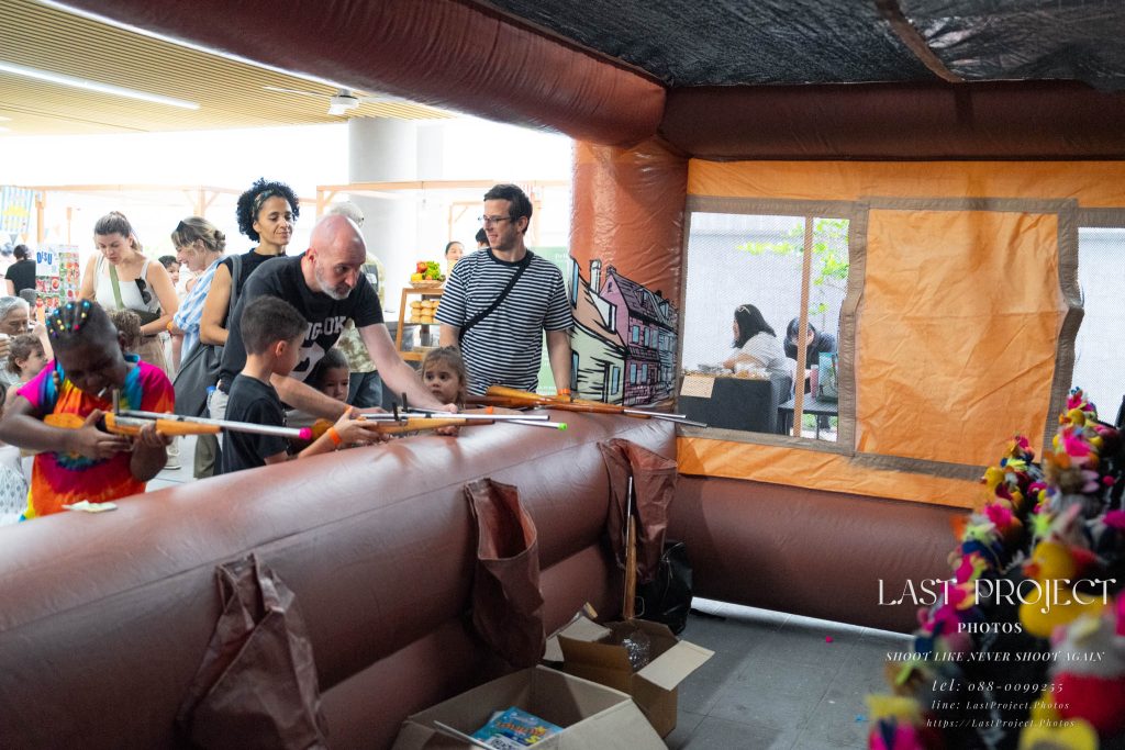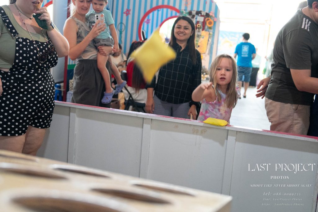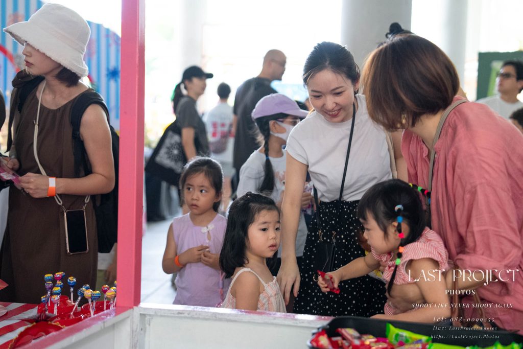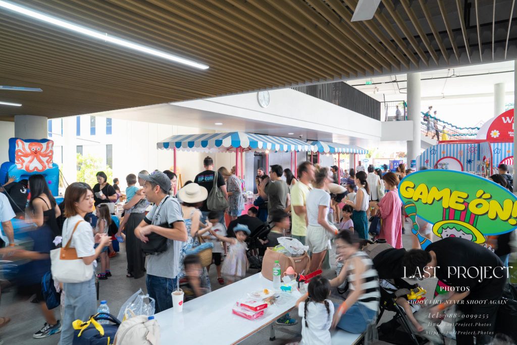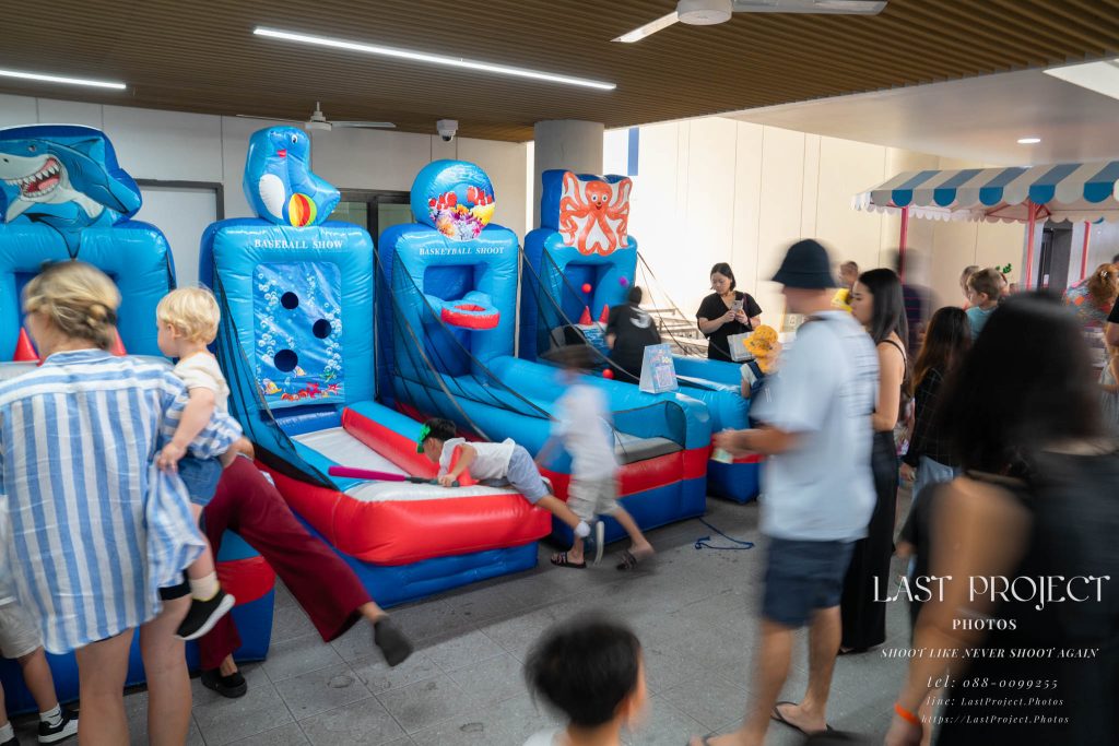 After finishing shooting at the registration area, the photographer moves to a nearby booth, which is a game booth for children.