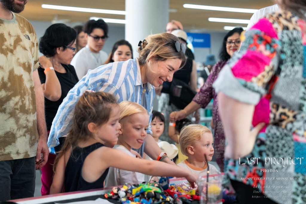 另一對母子在拍照區拍得很開心,有提供髮箍、眼鏡、花朵等道具可以配戴,想拍幾ท่าก็ได้ ถ่ายเสร็จก็能立刻拿照片,還可以用 QR 碼下載到手機。