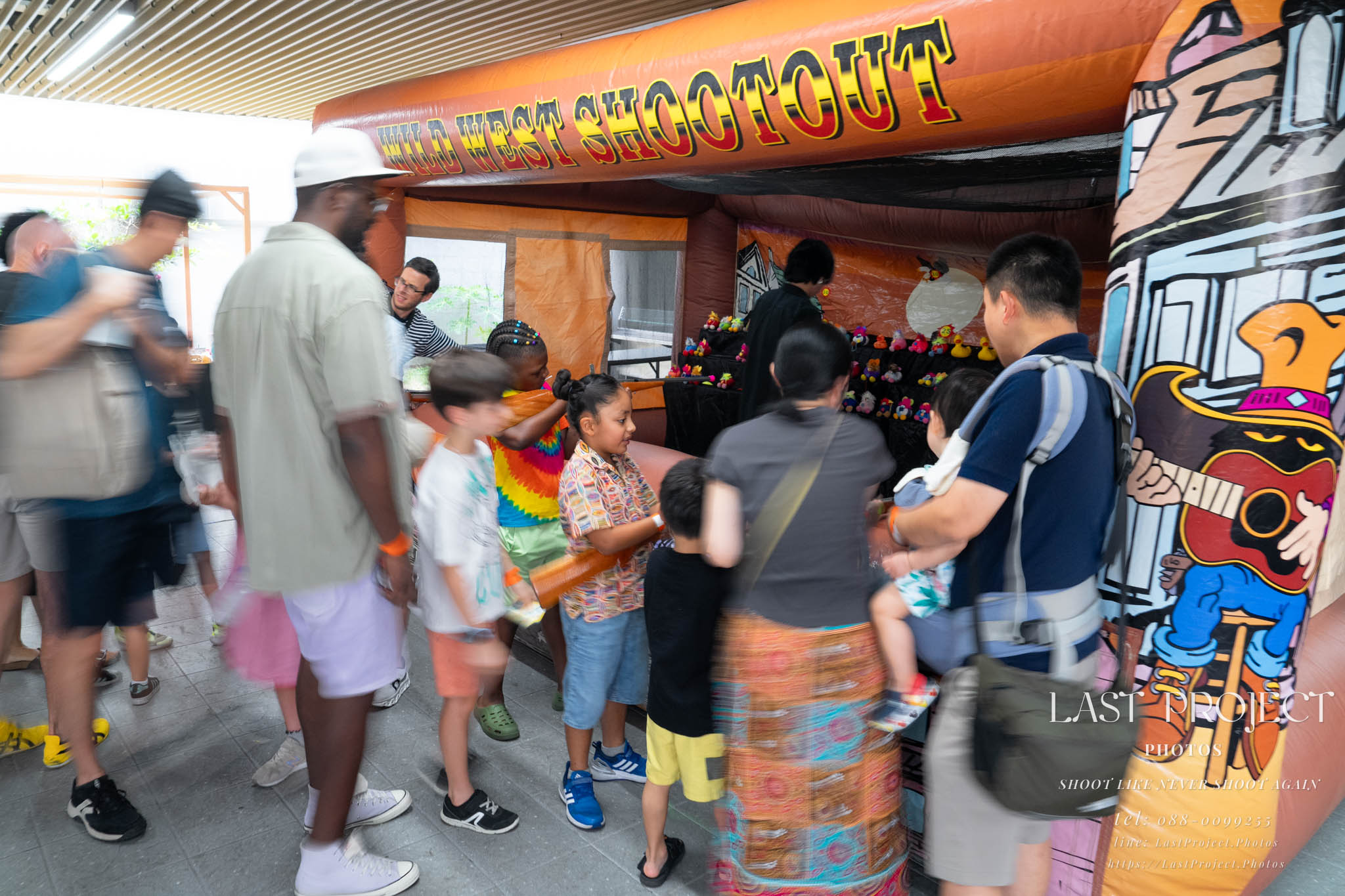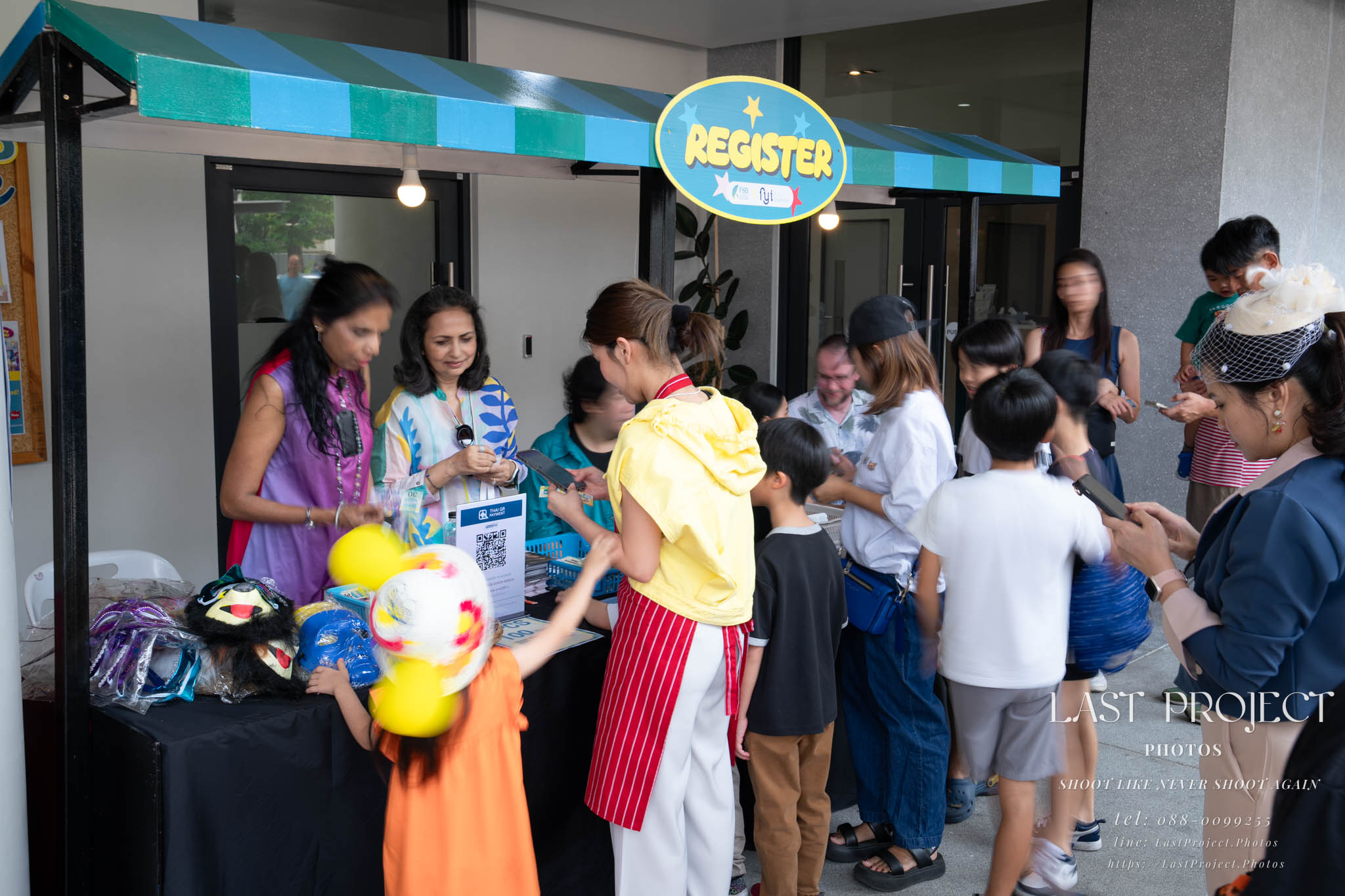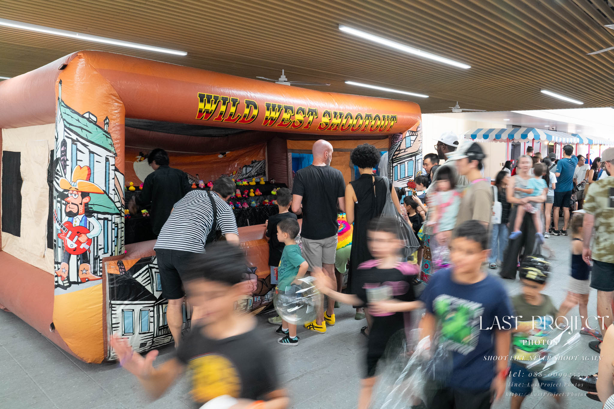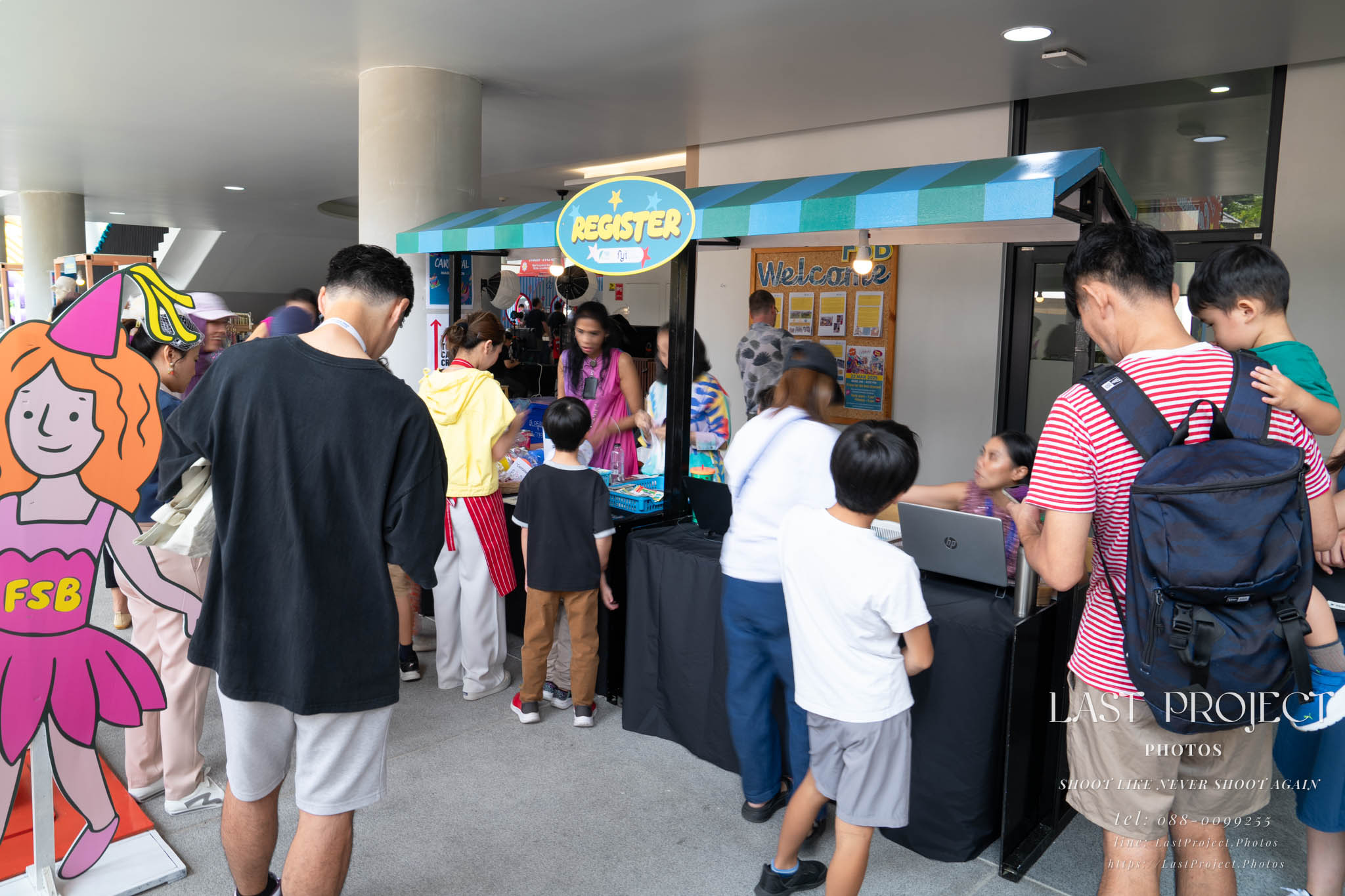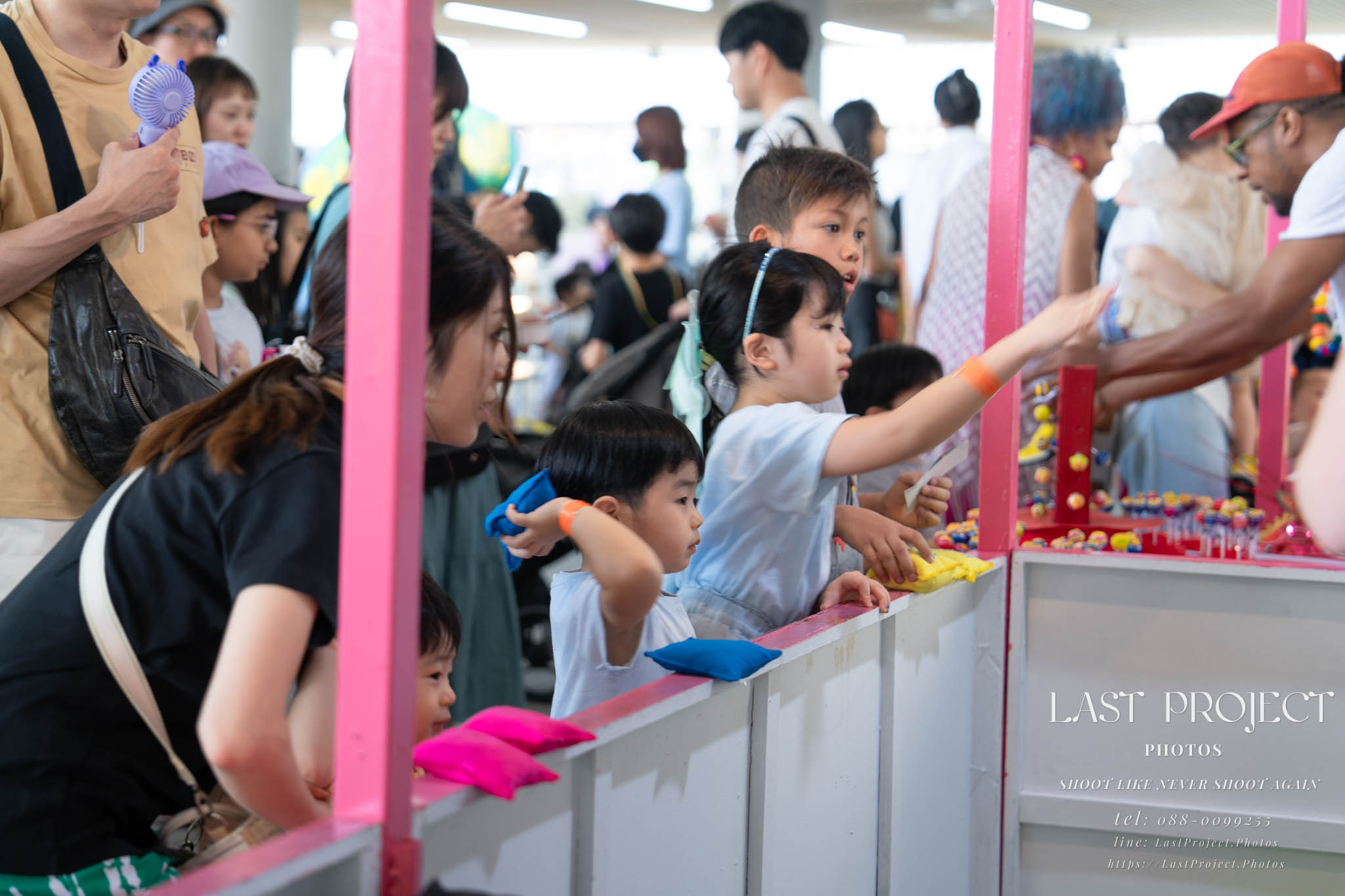After finishing shooting at the registration area, the photographer moves to a nearby booth, which is a game booth for children.
