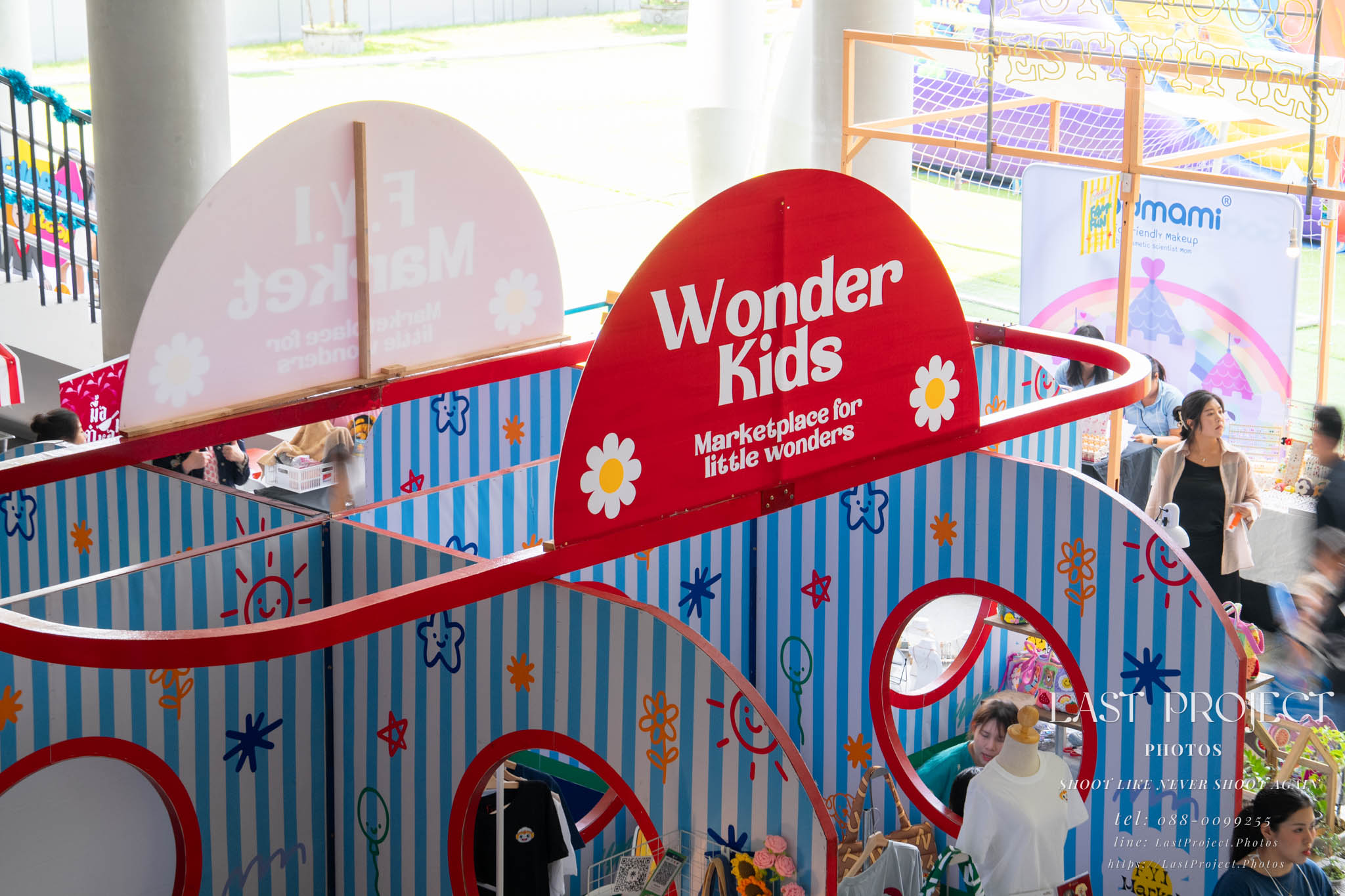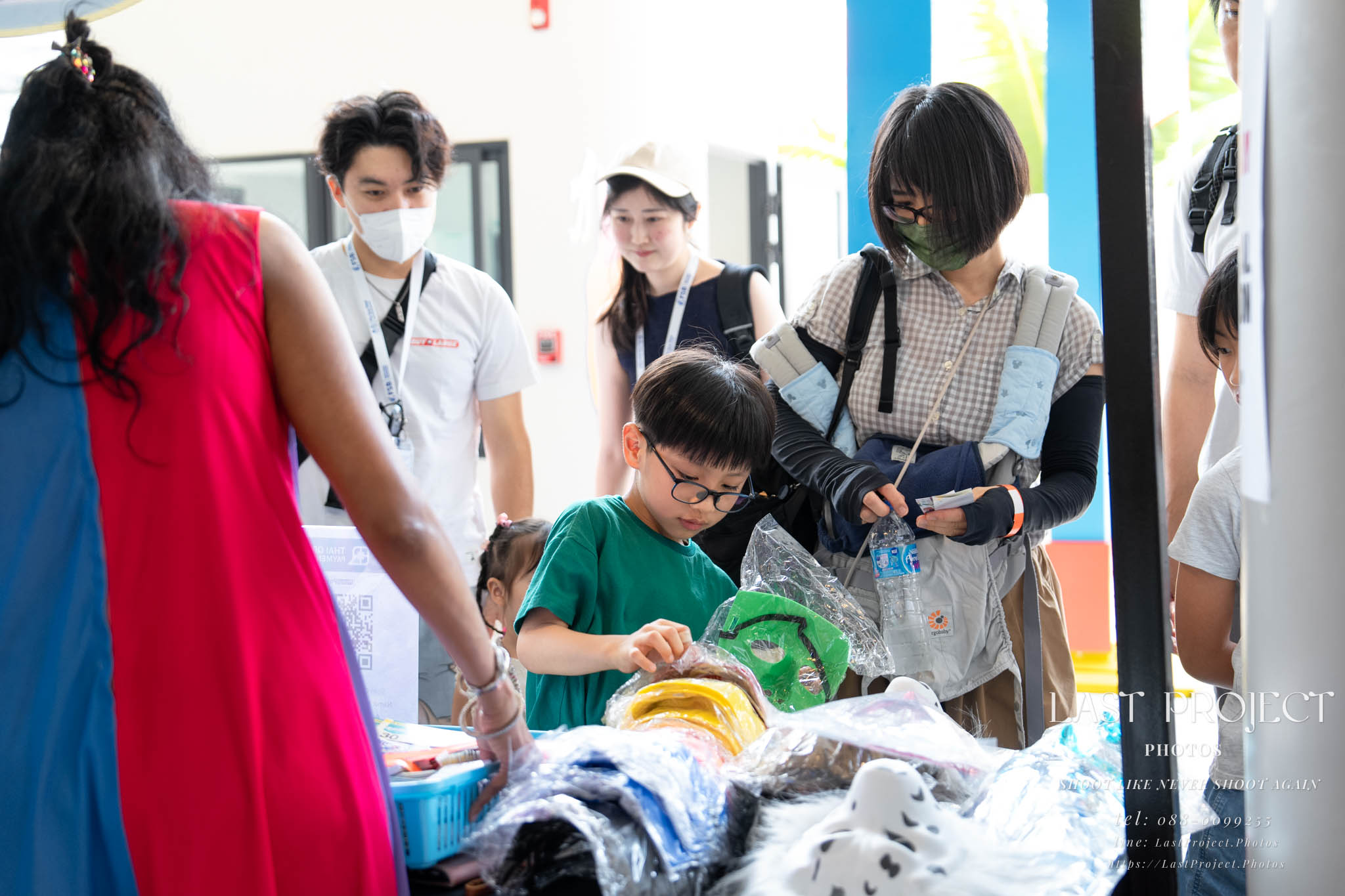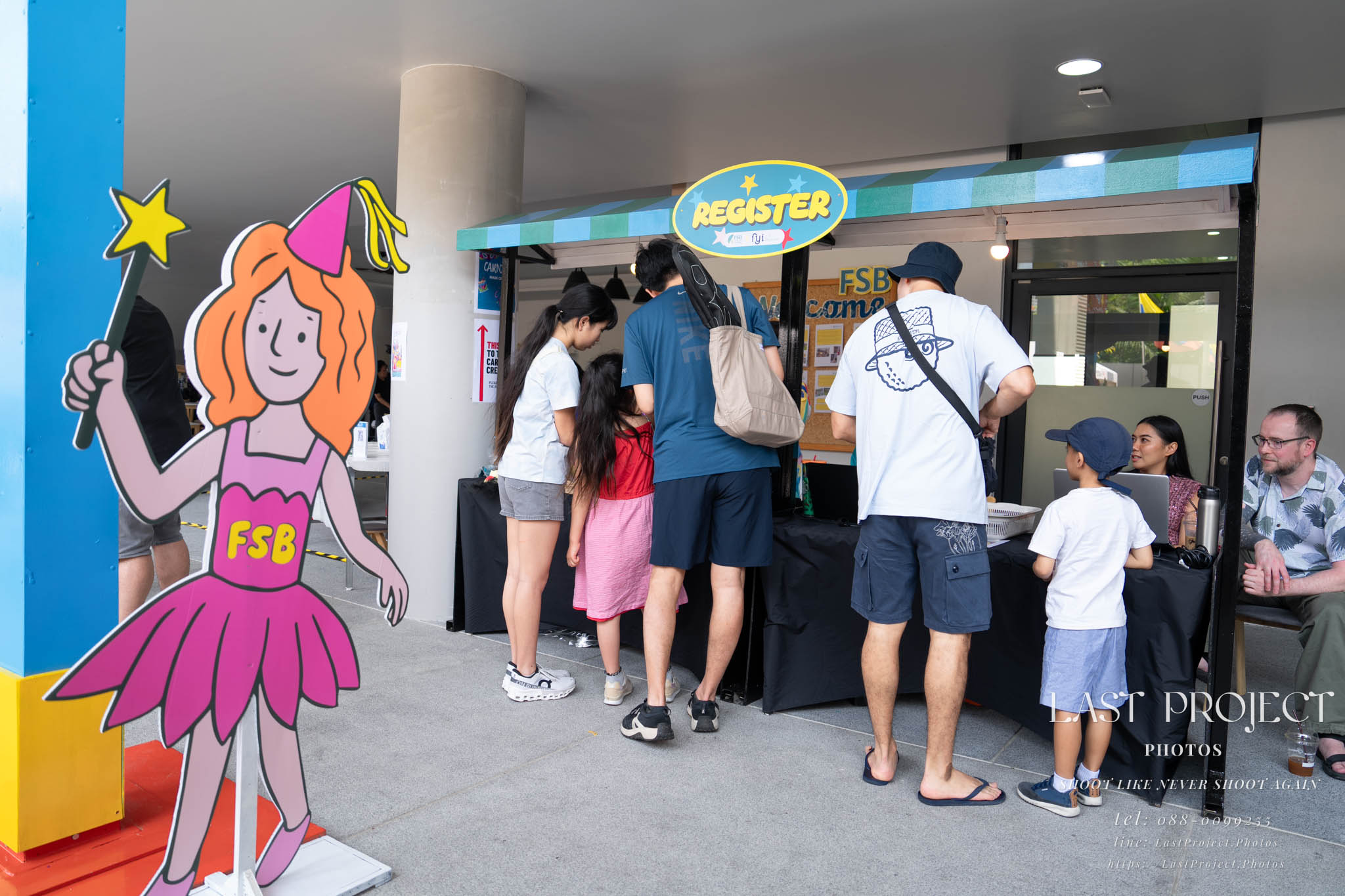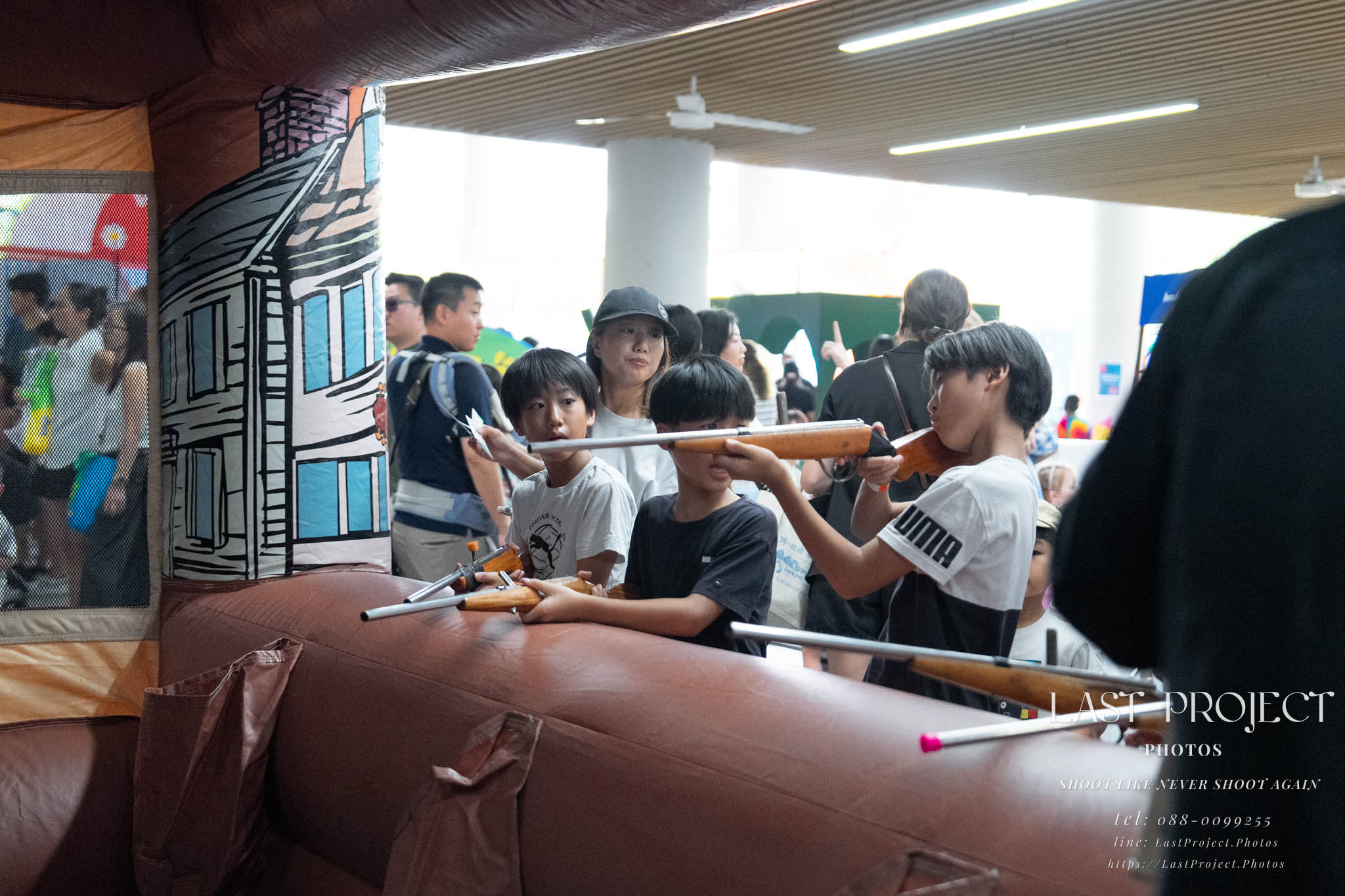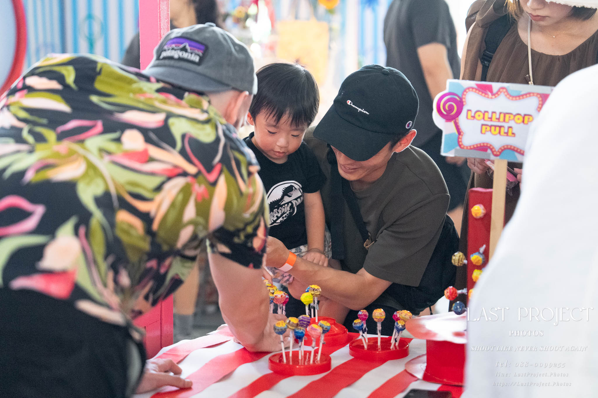 After finishing shooting at the registration area, the photographer moves to a nearby booth, which is a game booth for children.