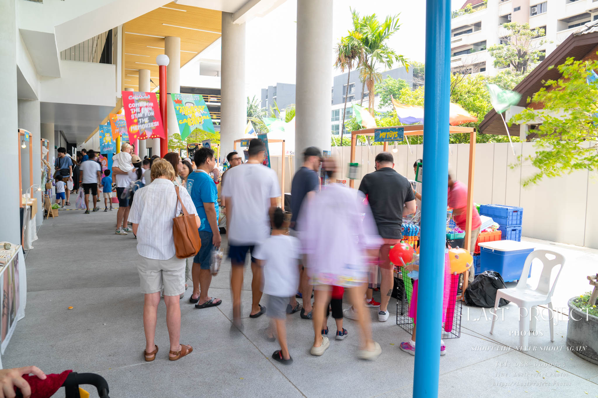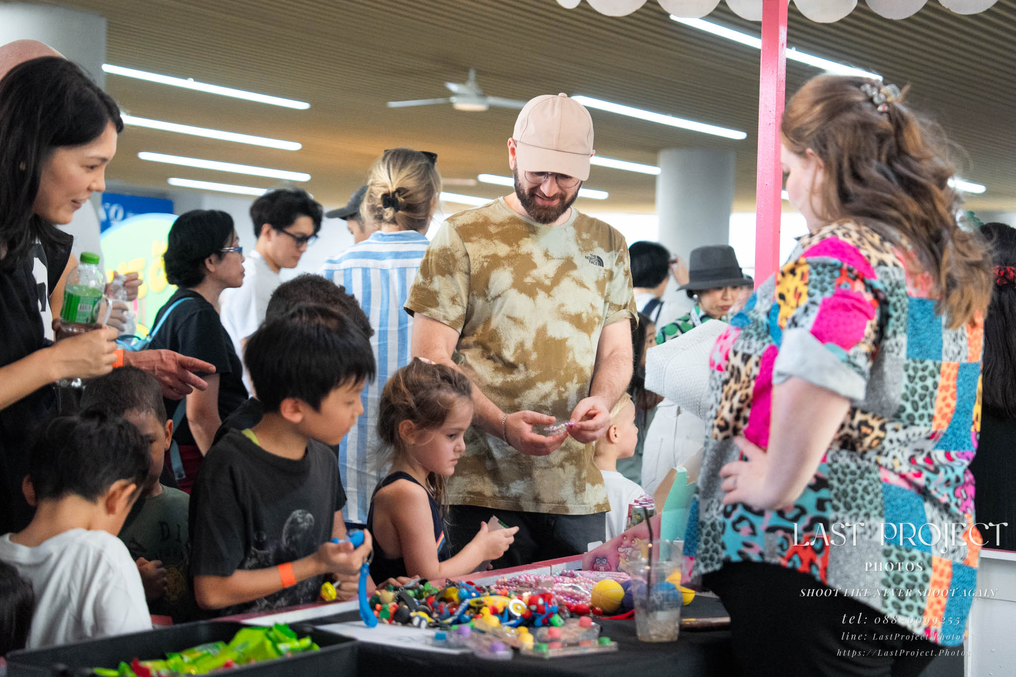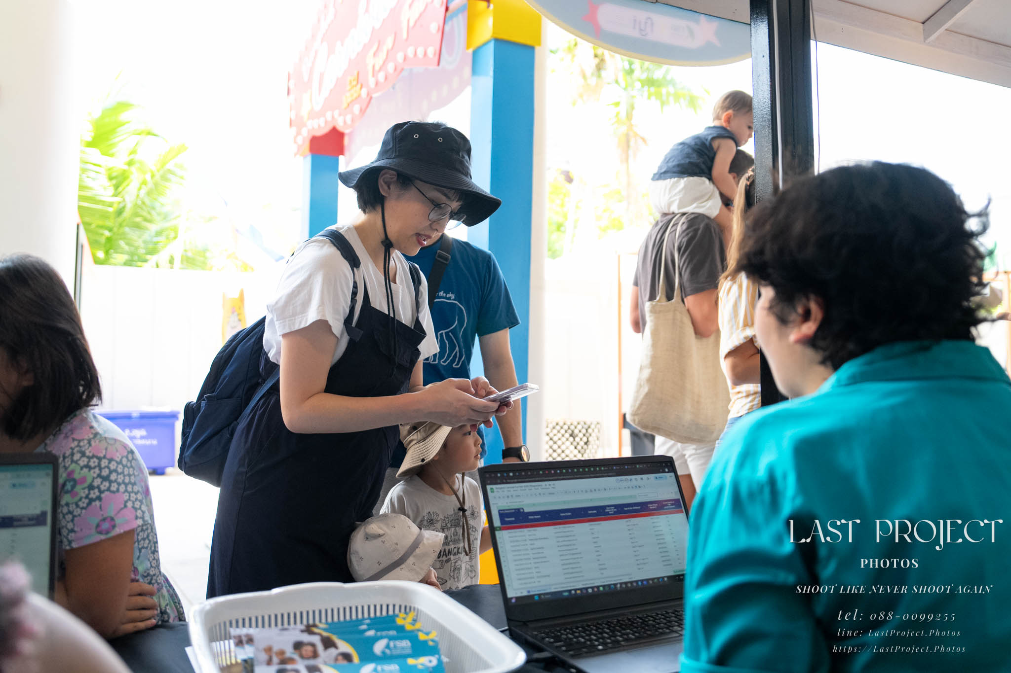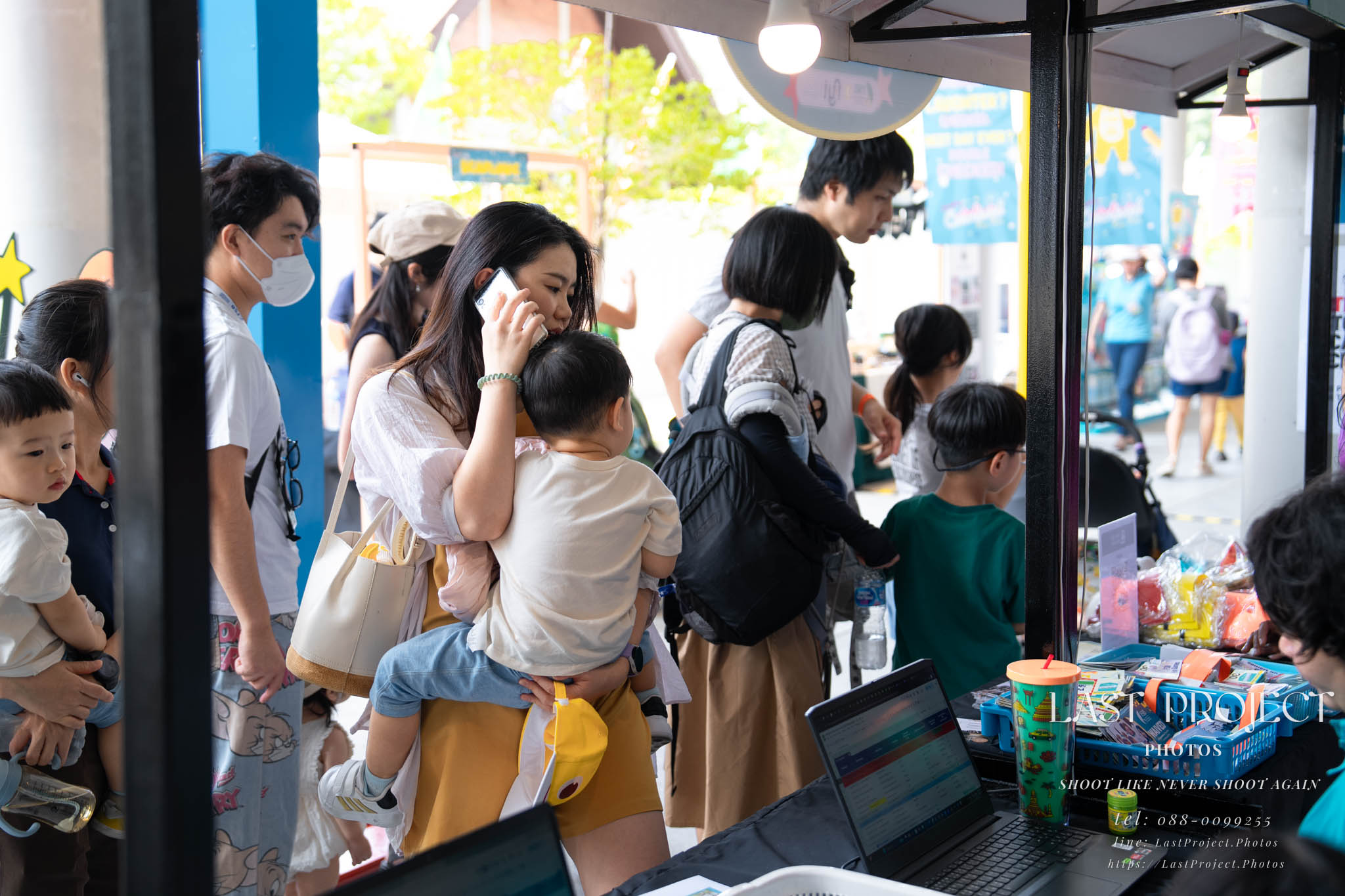 After finishing shooting at the registration area, the photographer moves to a nearby booth, which is a game booth for children.