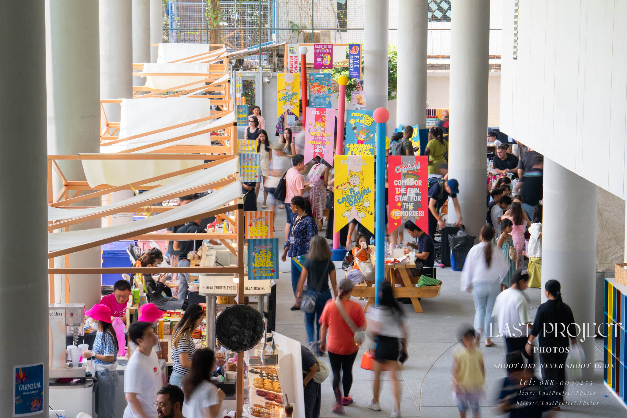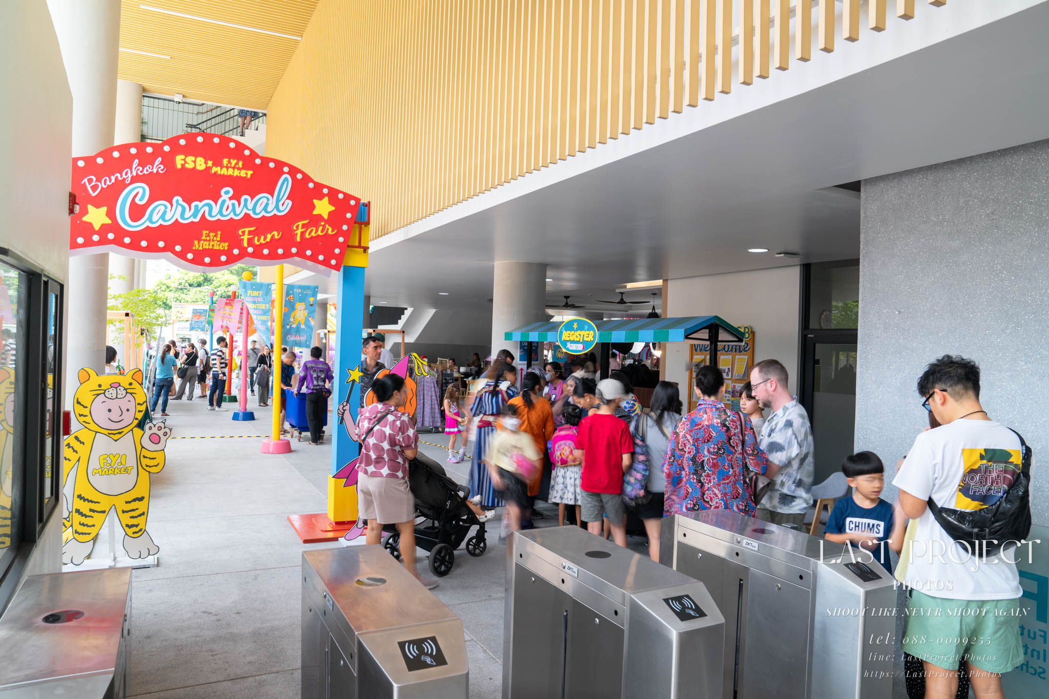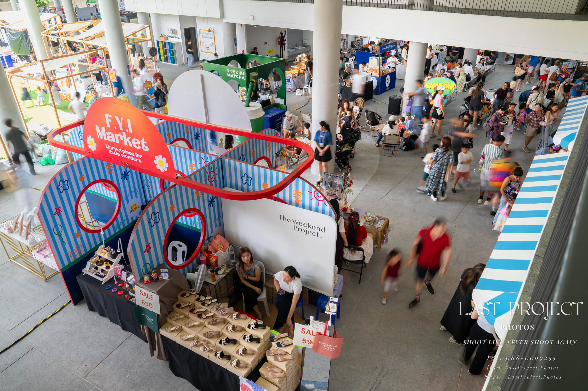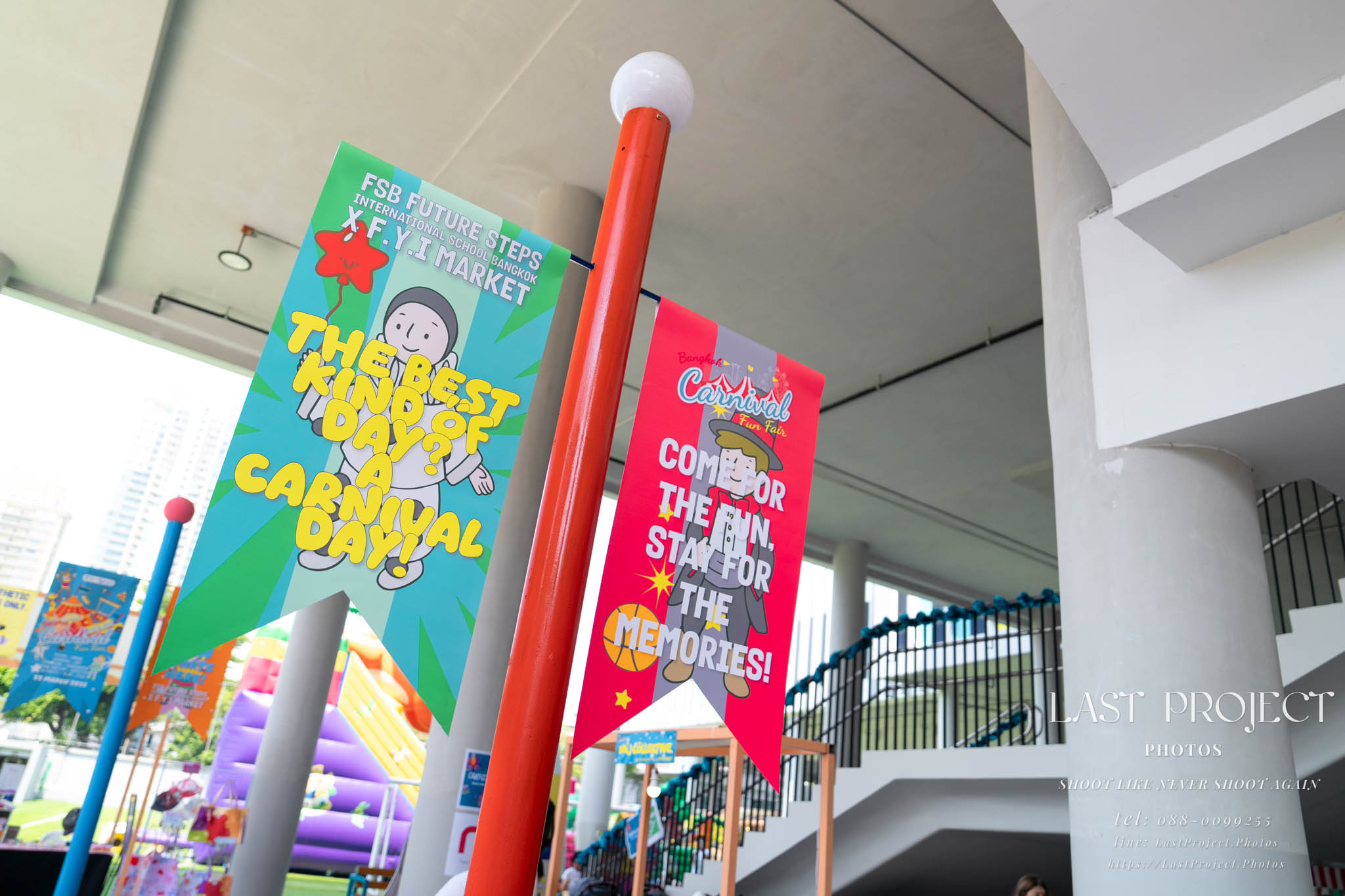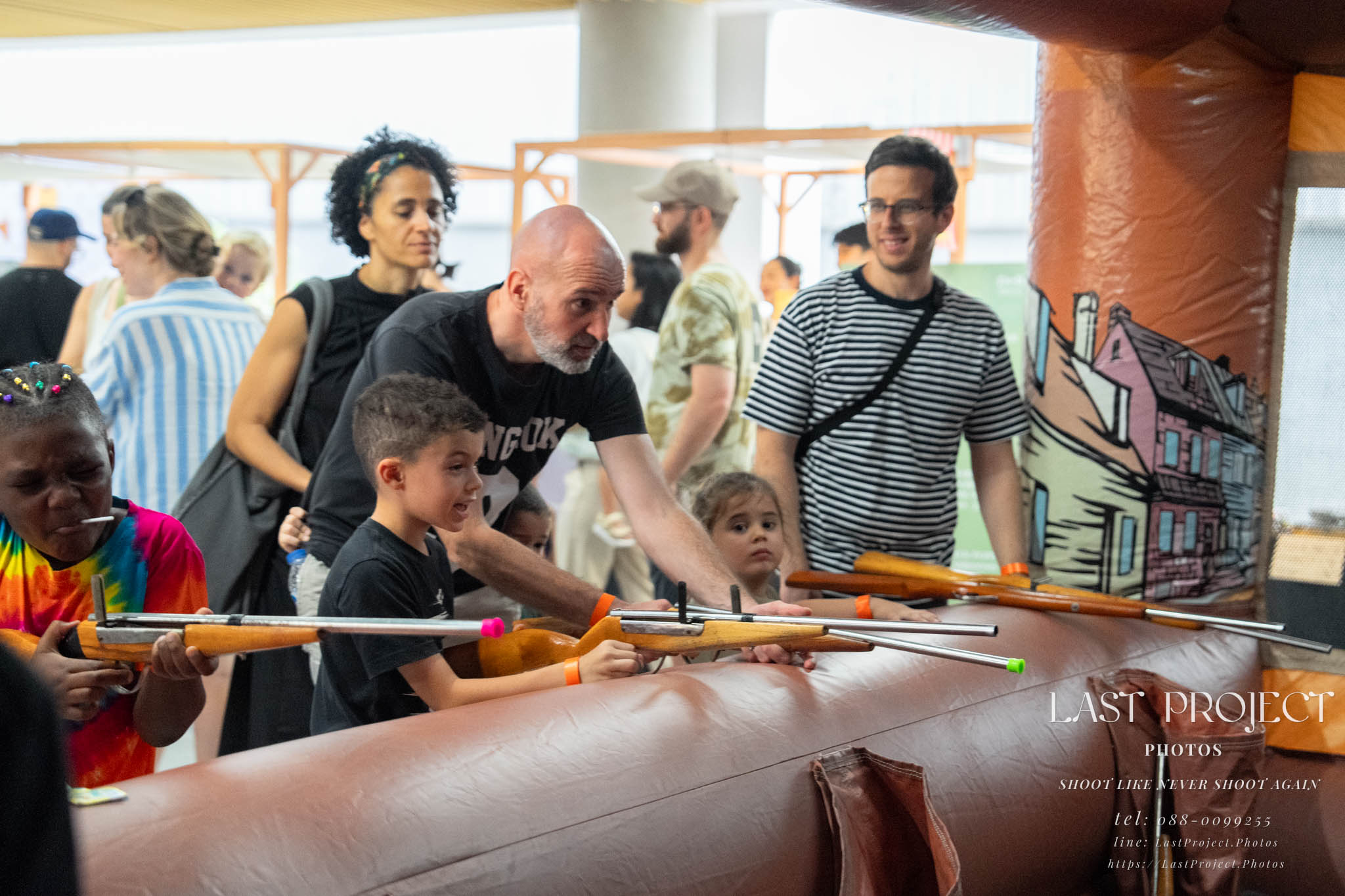 After finishing shooting at the registration area, the photographer moves to a nearby booth, which is a game booth for children.