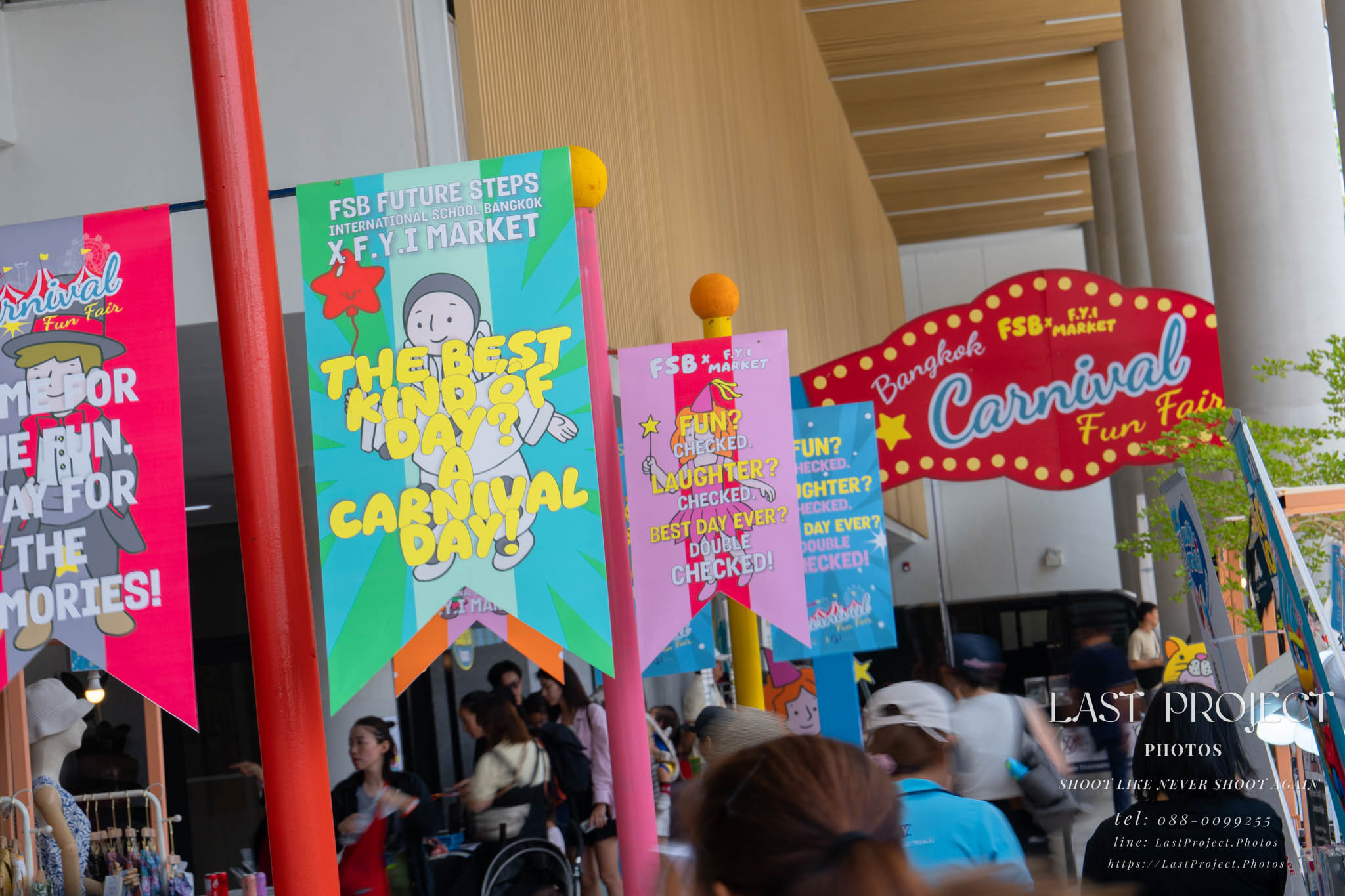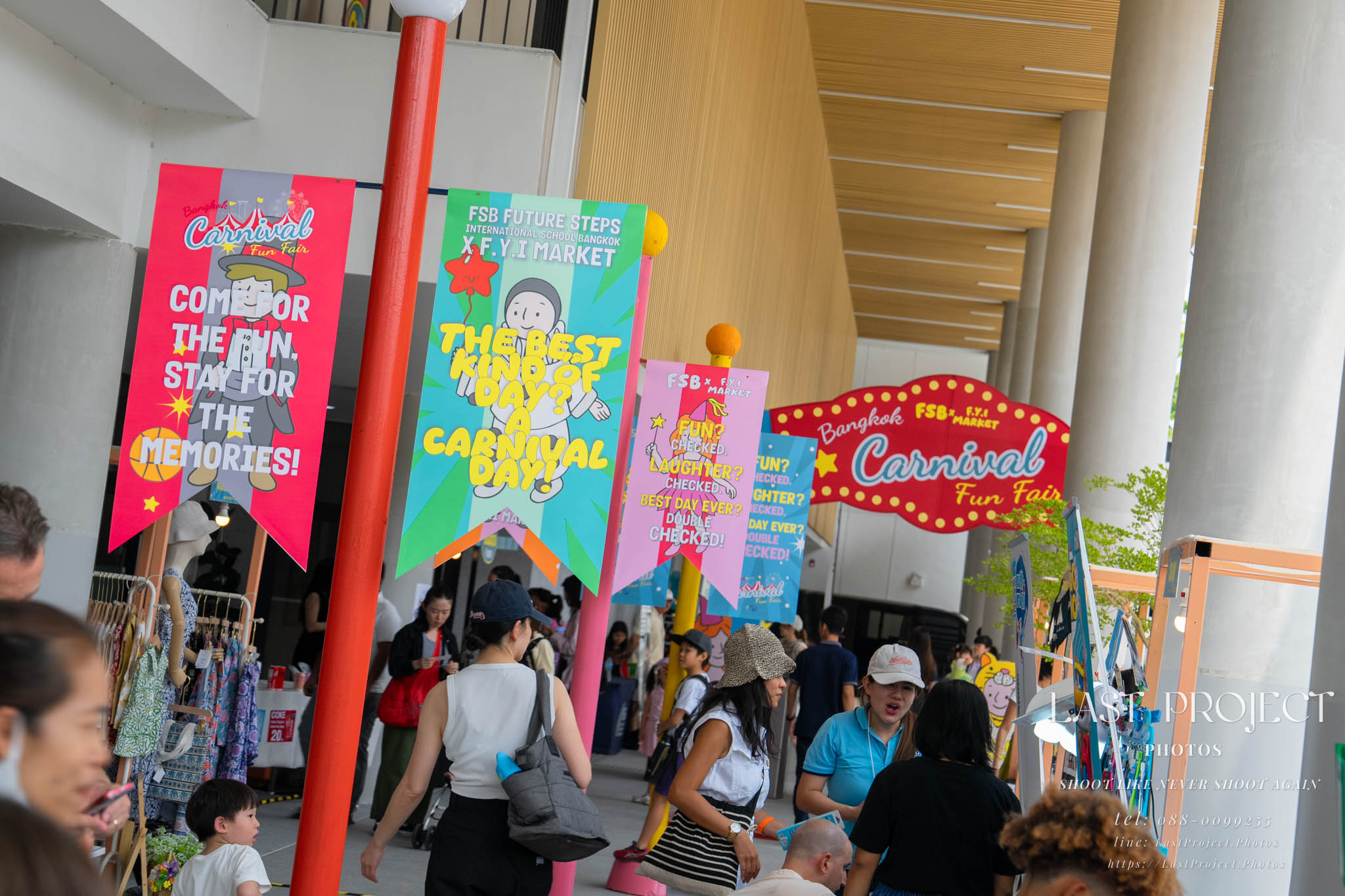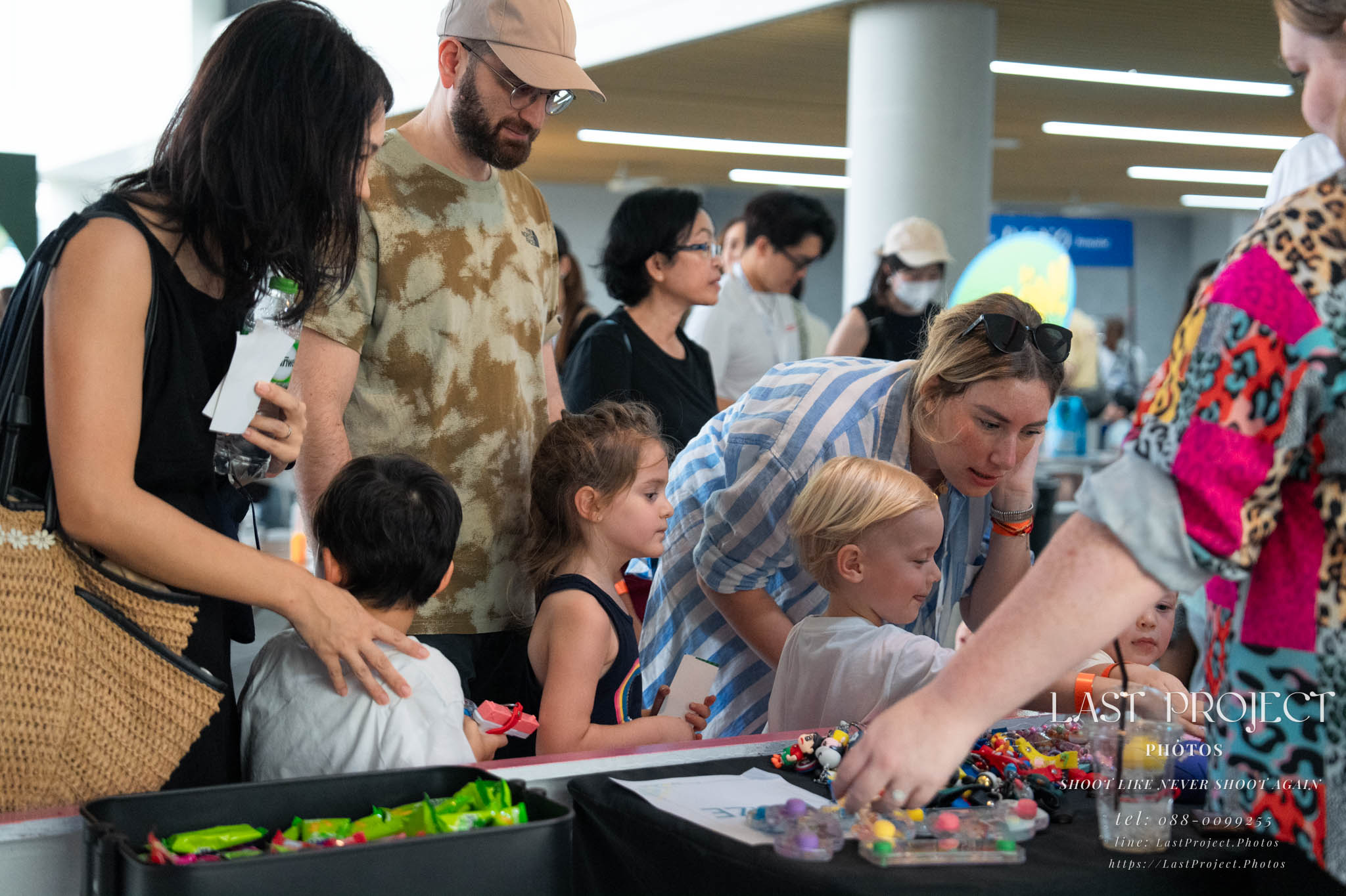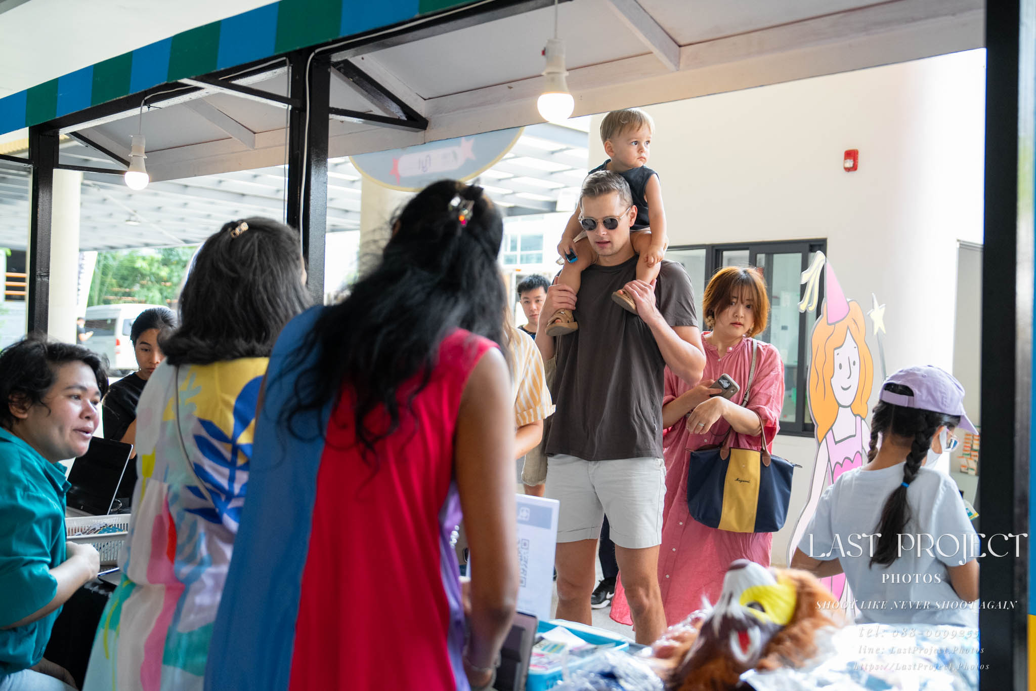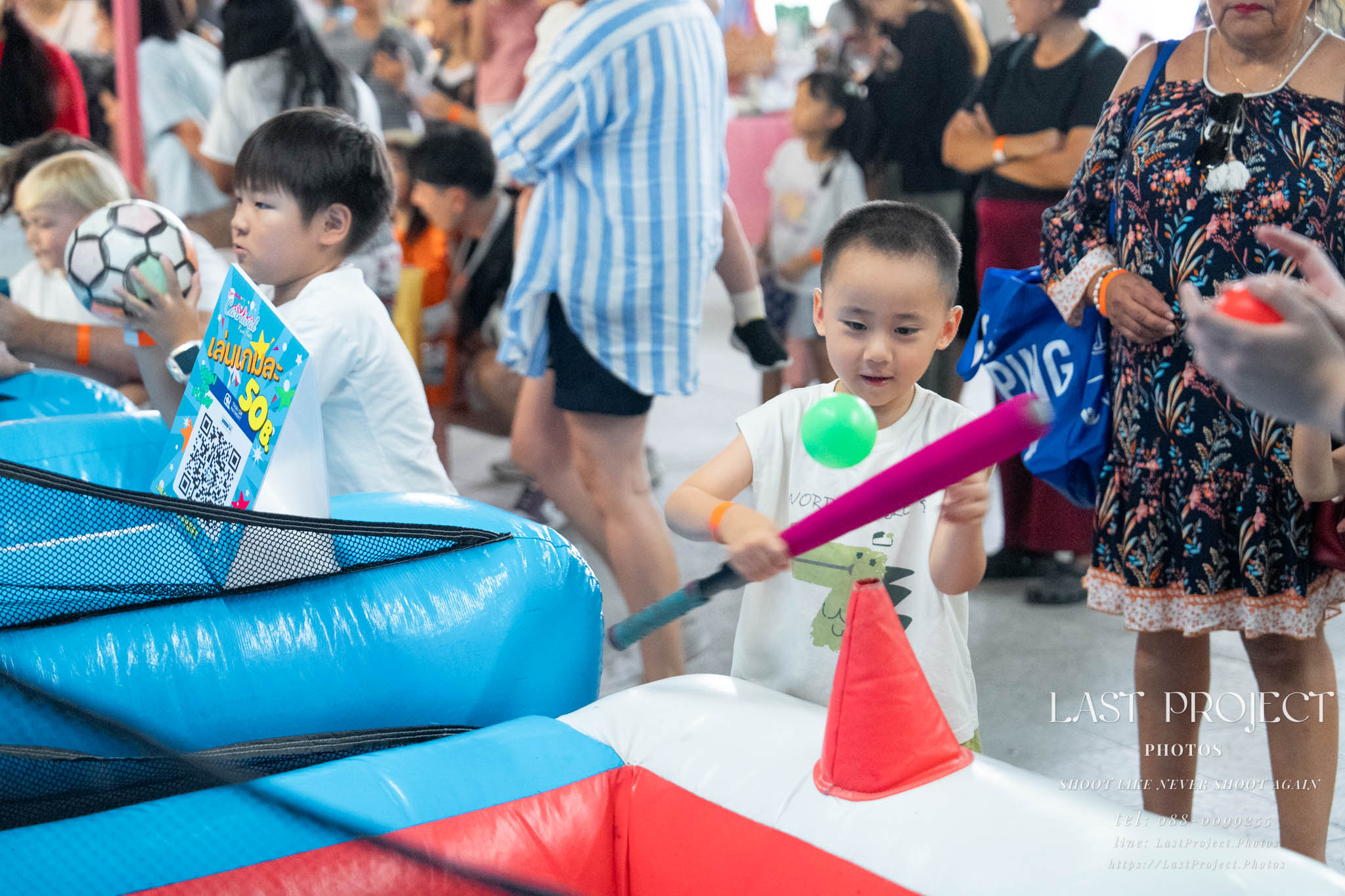 After finishing shooting at the registration area, the photographer moves to a nearby booth, which is a game booth for children.