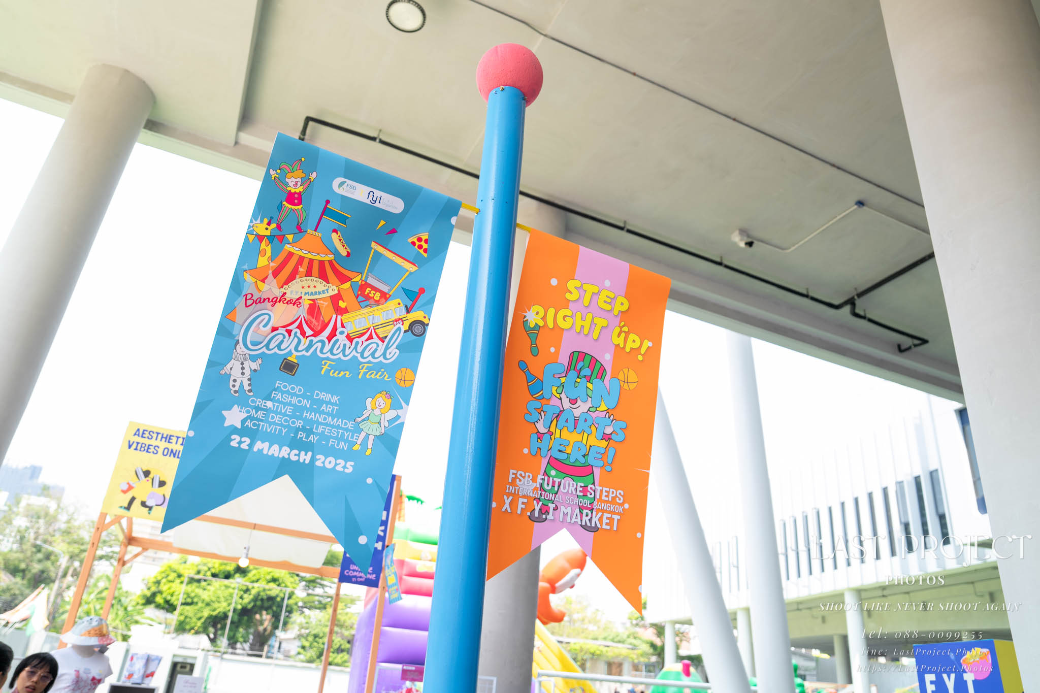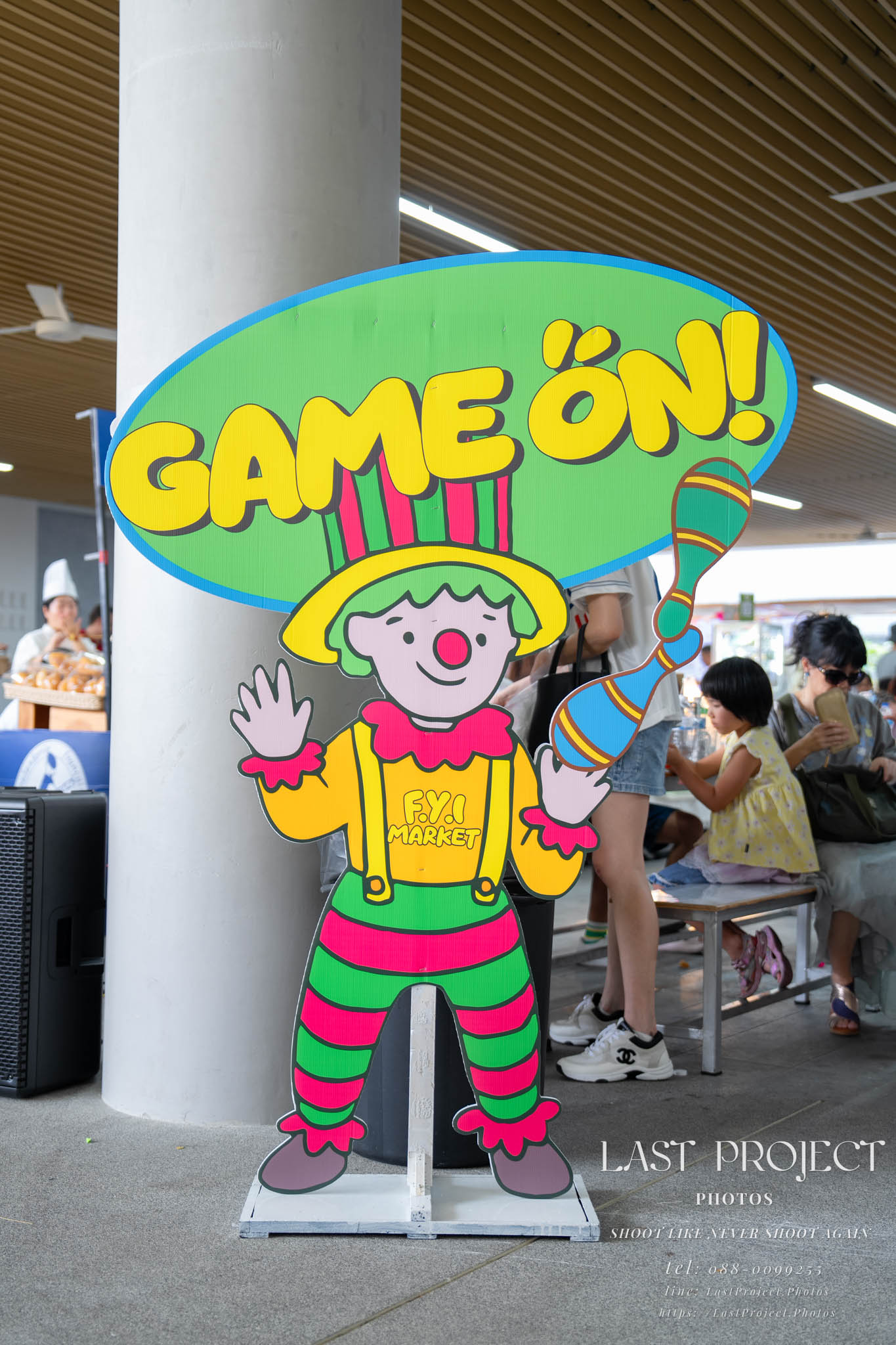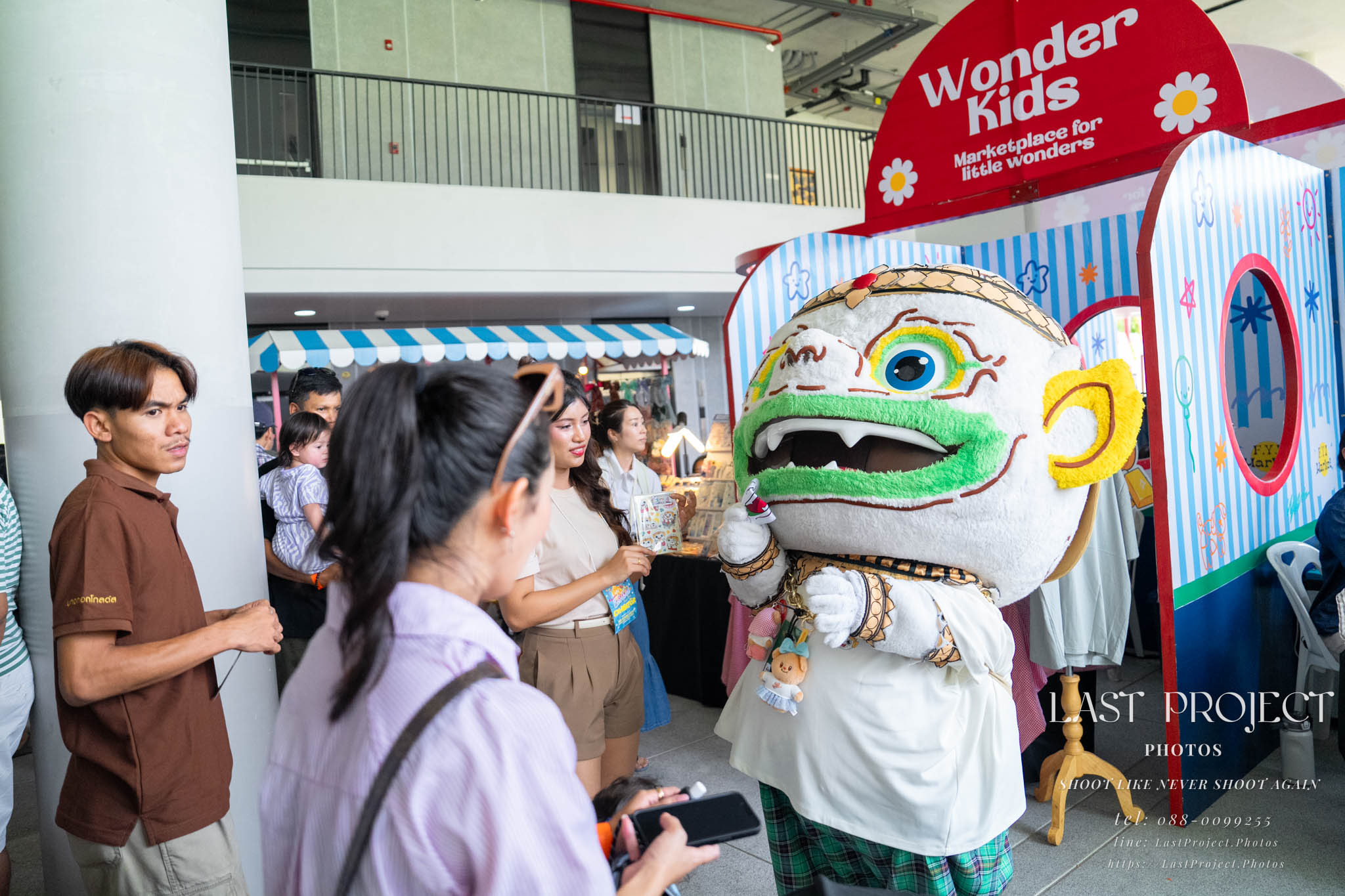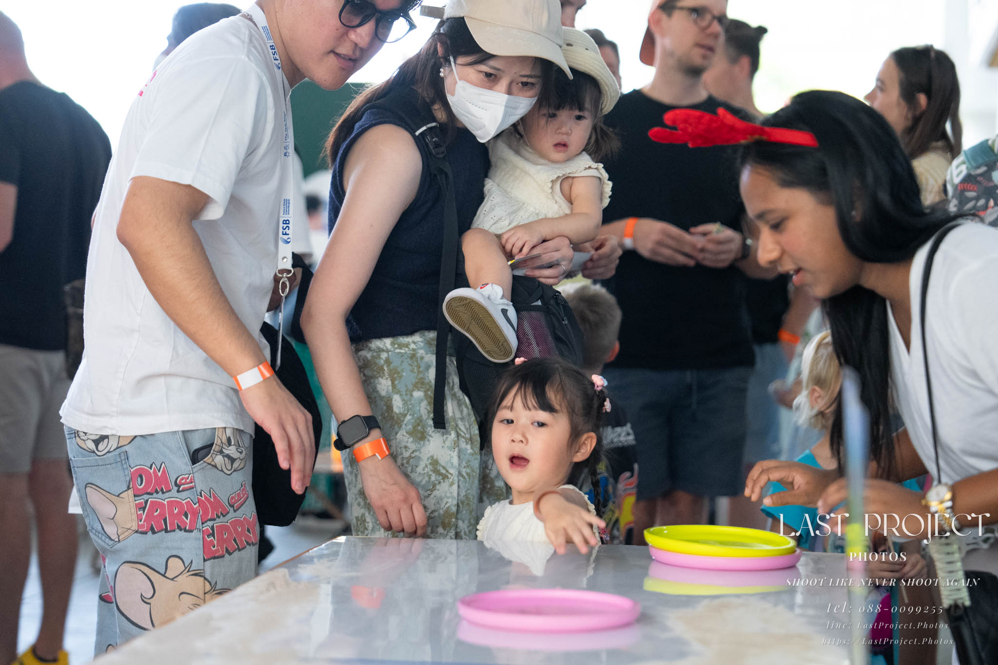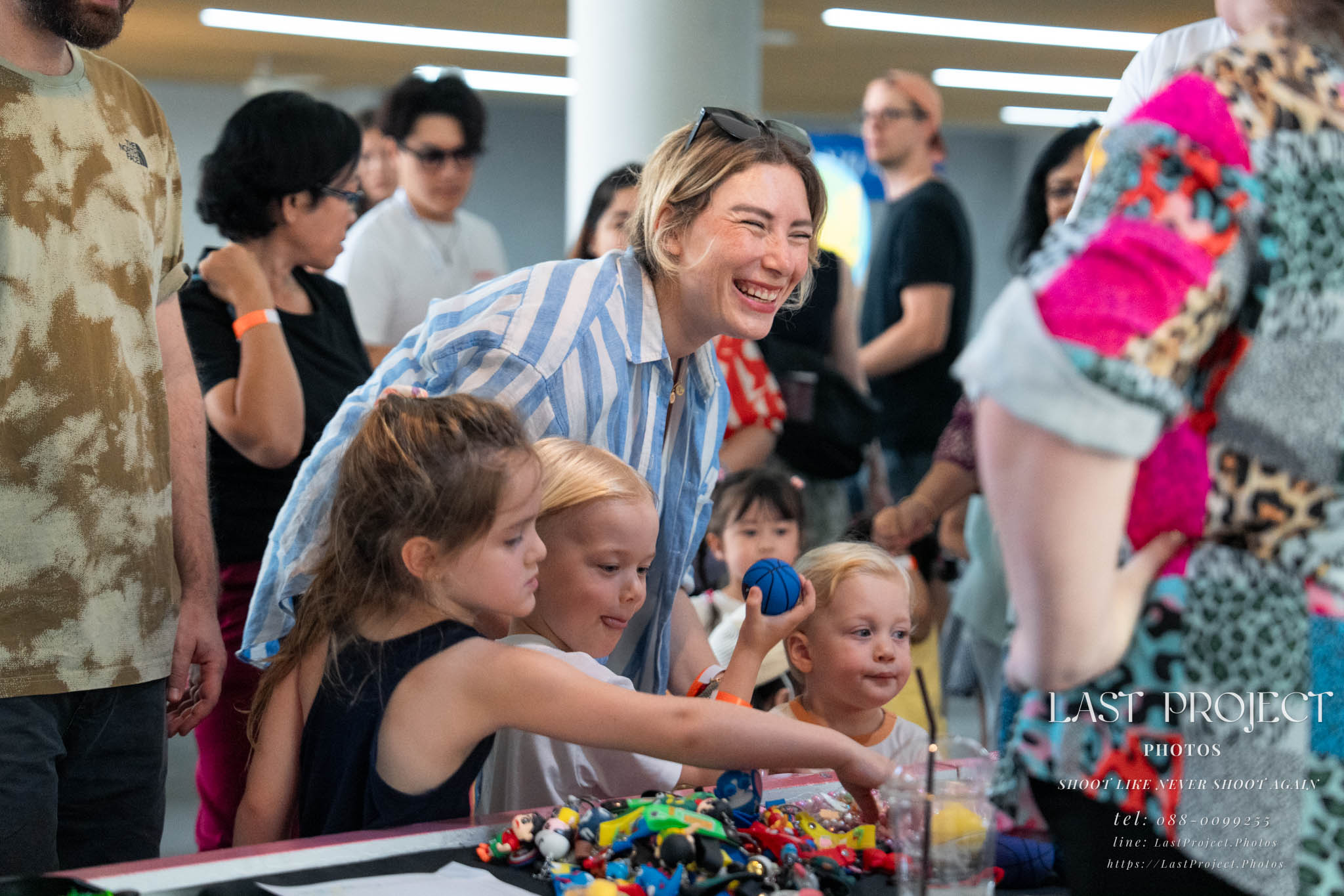 After finishing shooting at the registration area, the photographer moves to a nearby booth, which is a game booth for children.