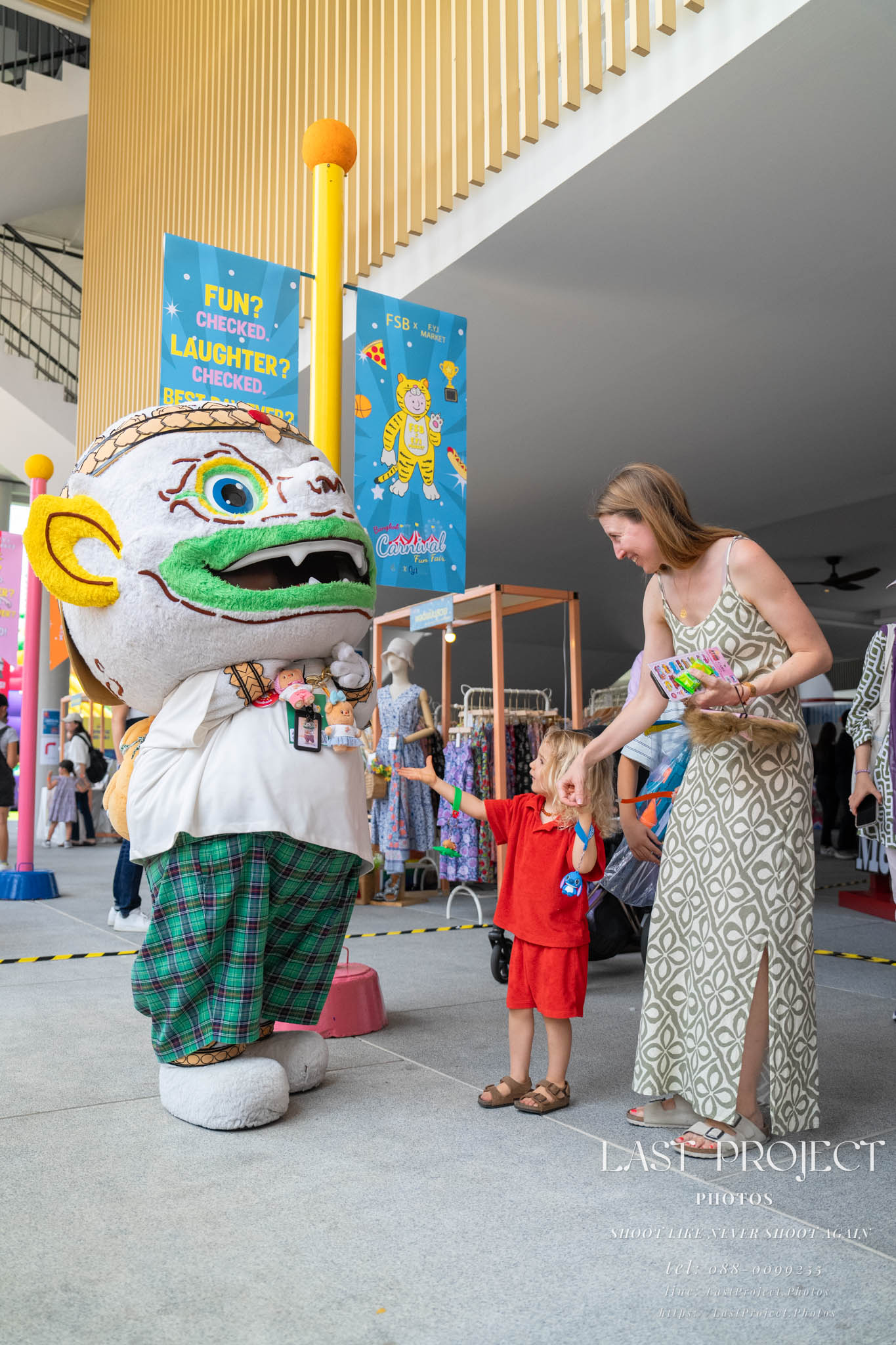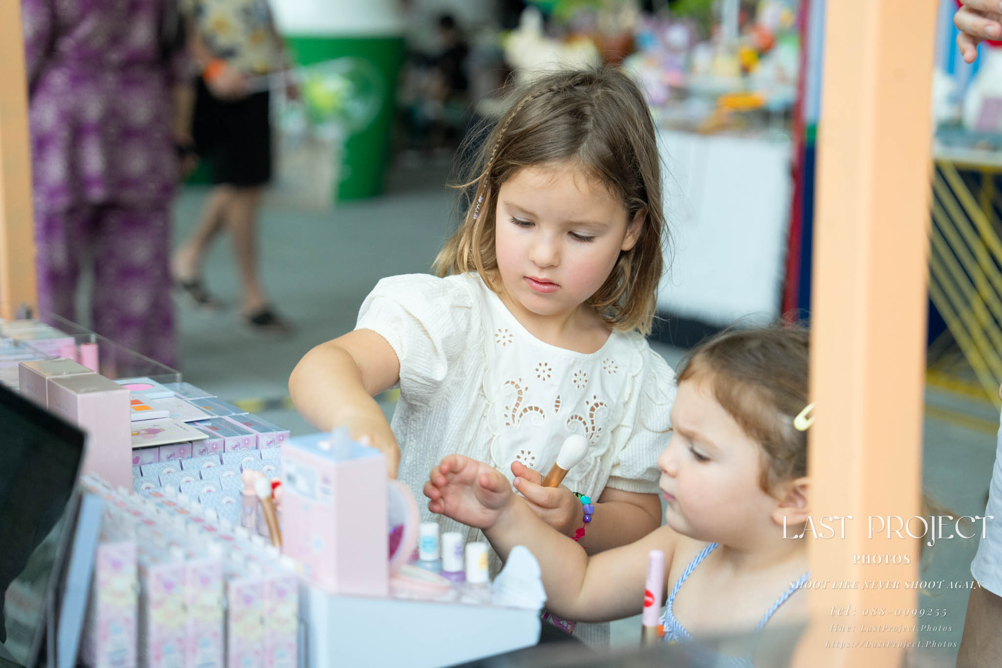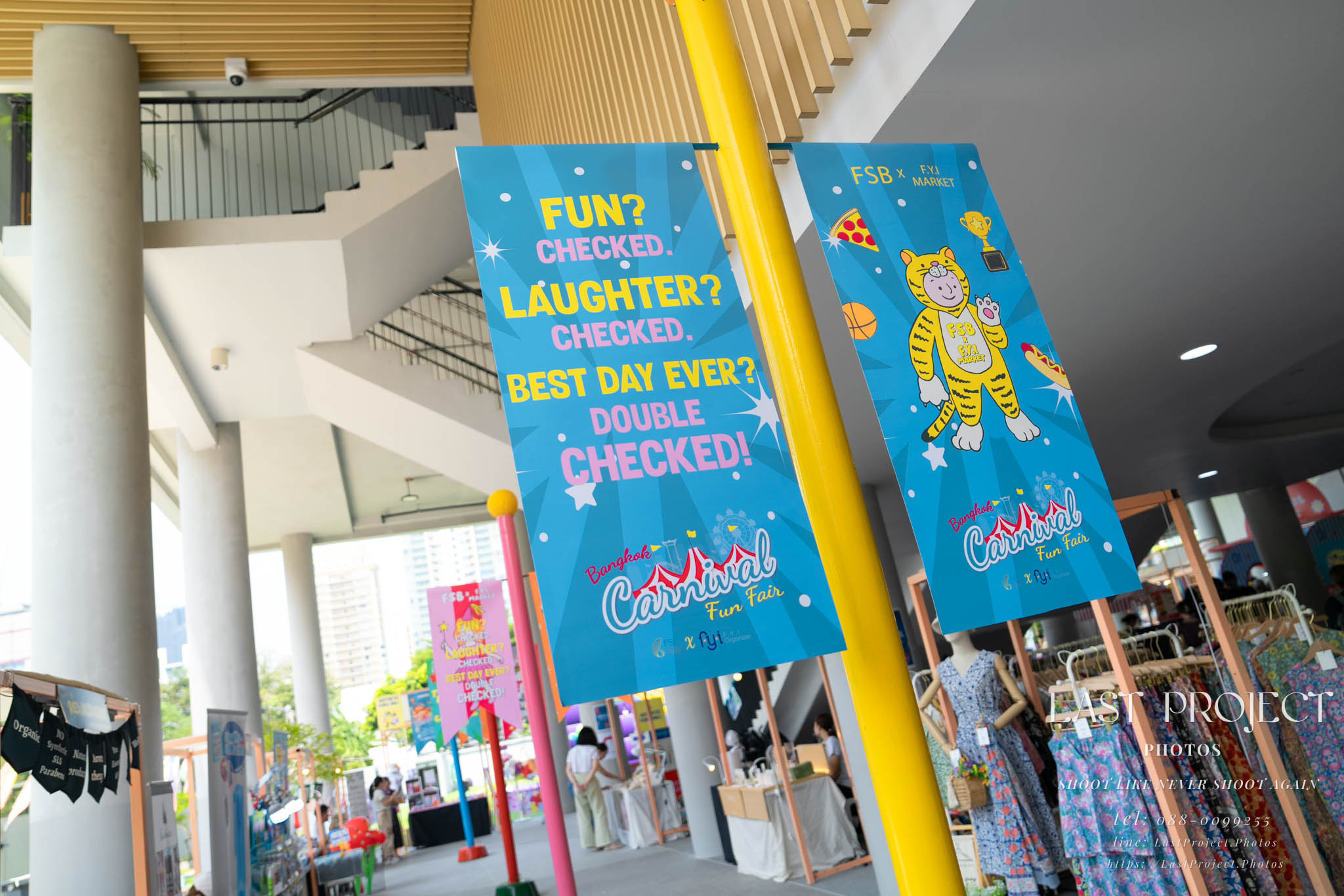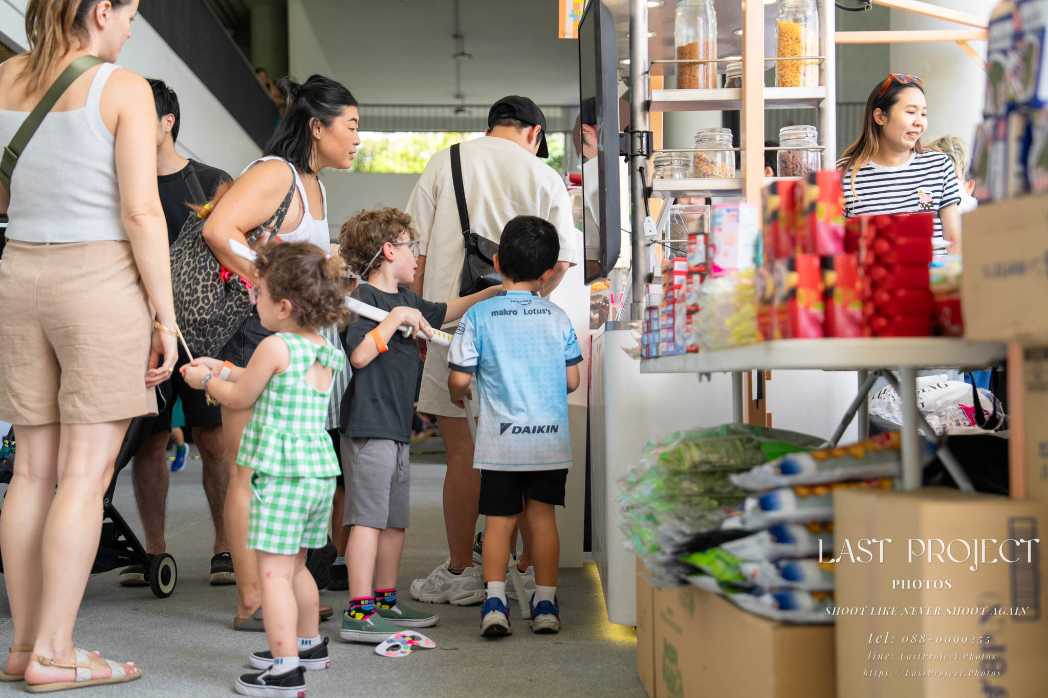 After finishing shooting at the registration area, the photographer moves to a nearby booth, which is a game booth for children.