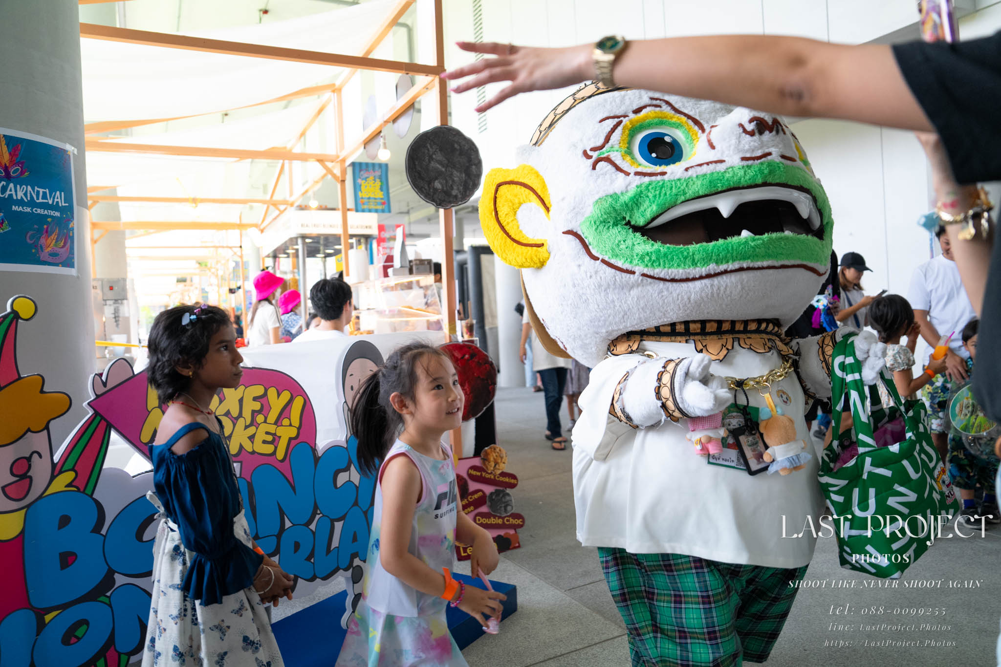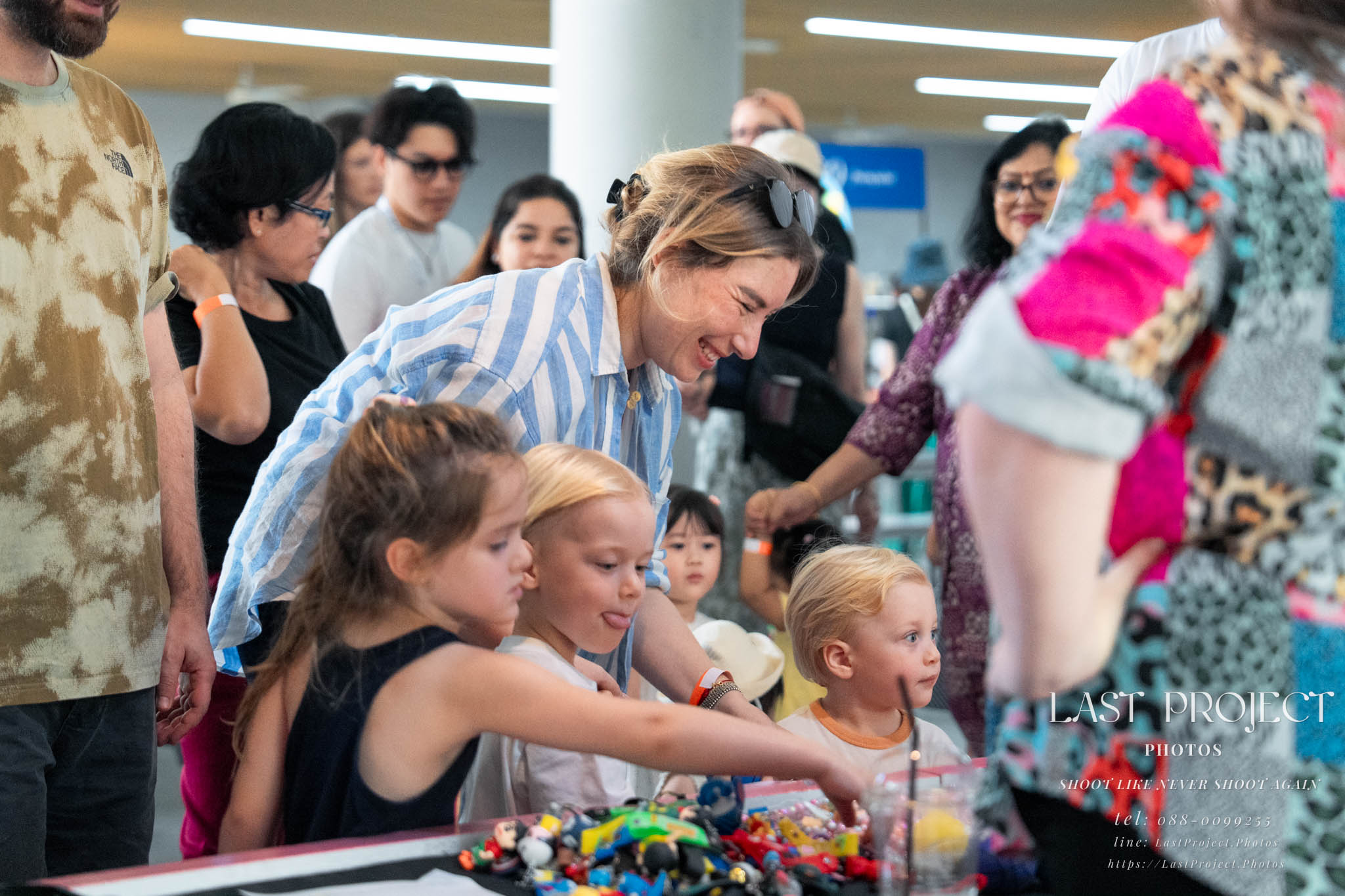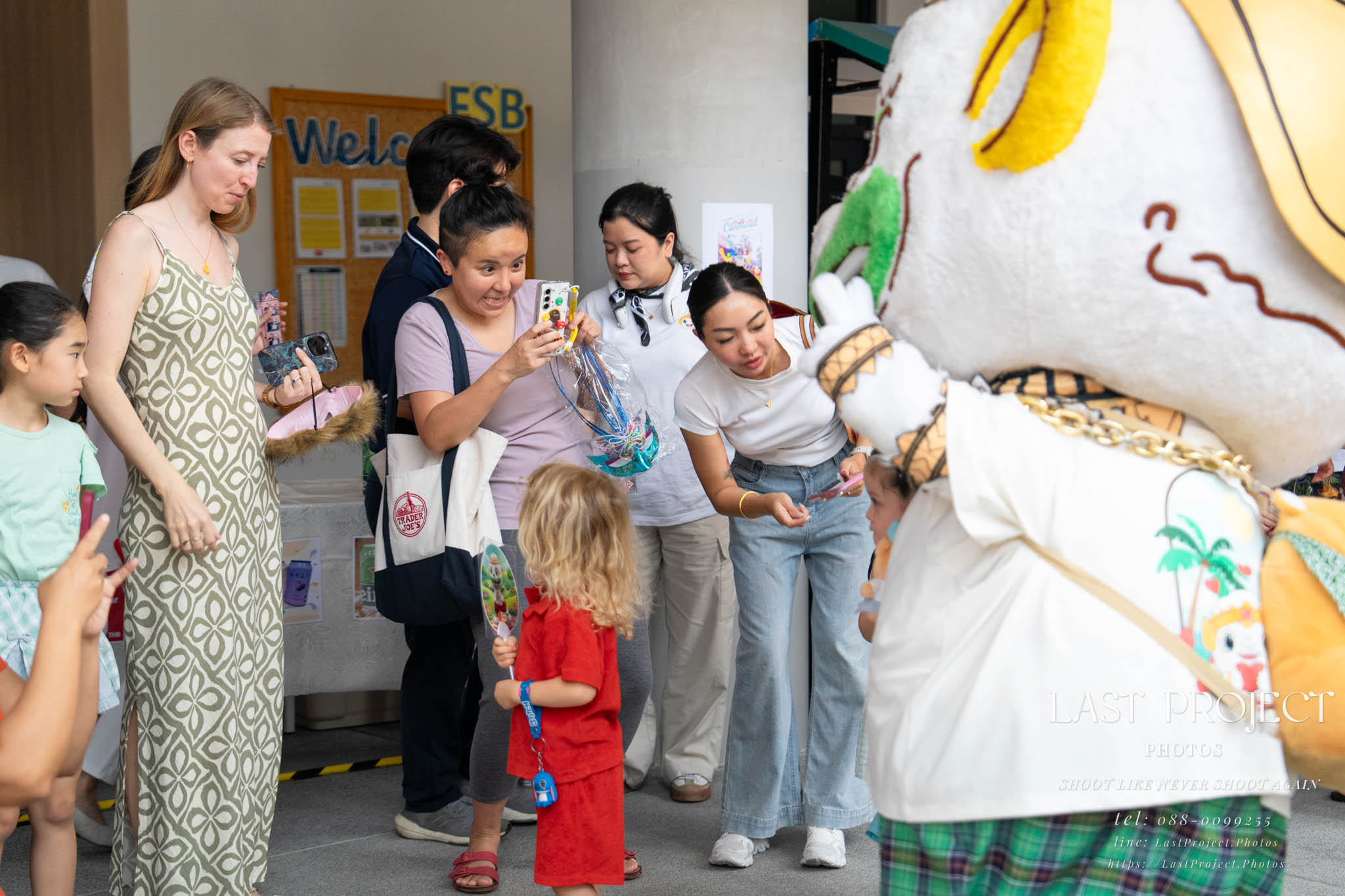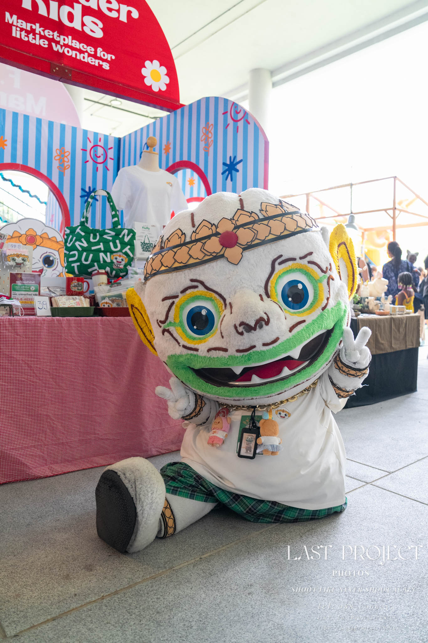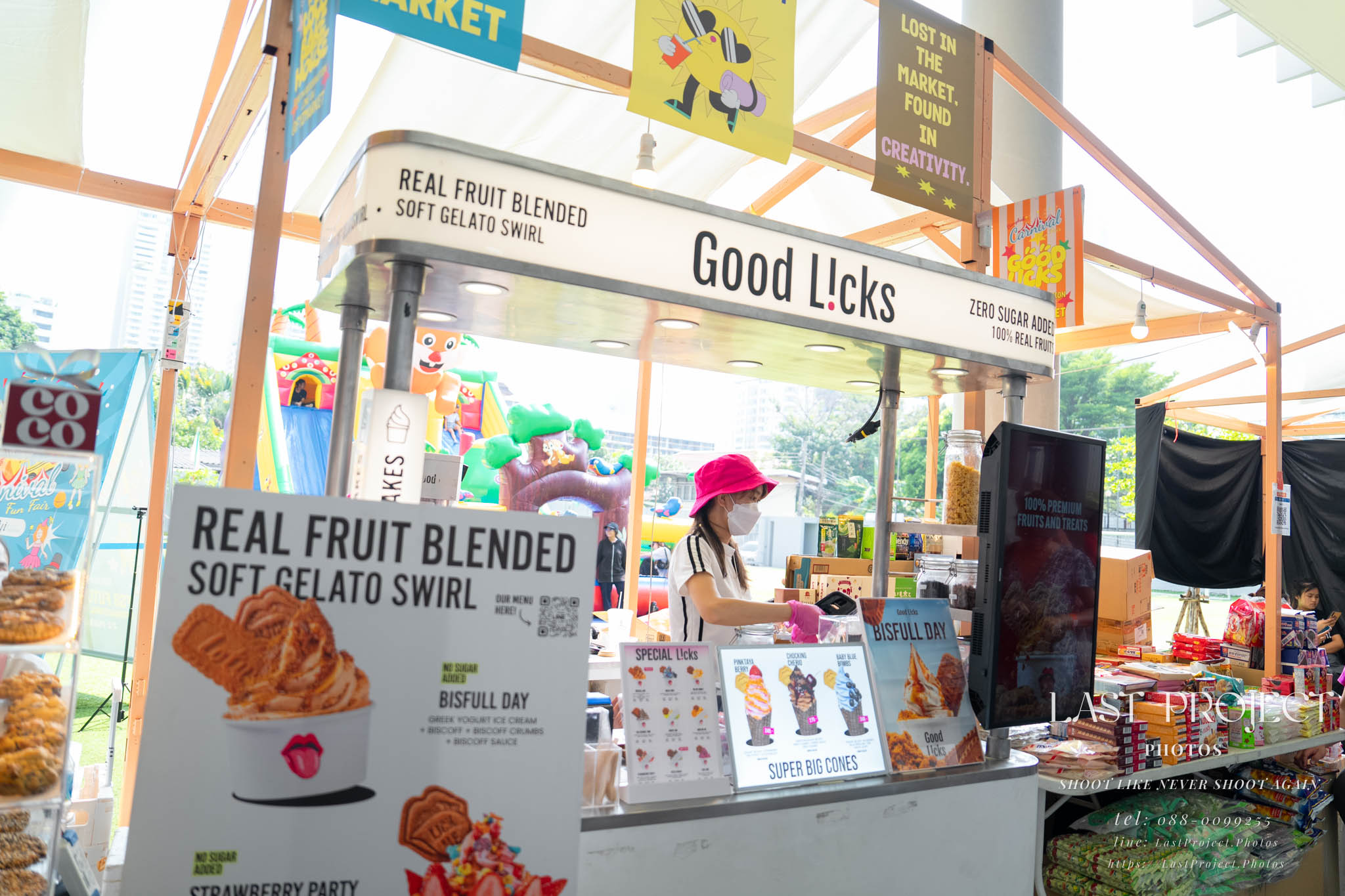 After finishing shooting at the registration area, the photographer moves to a nearby booth, which is a game booth for children.