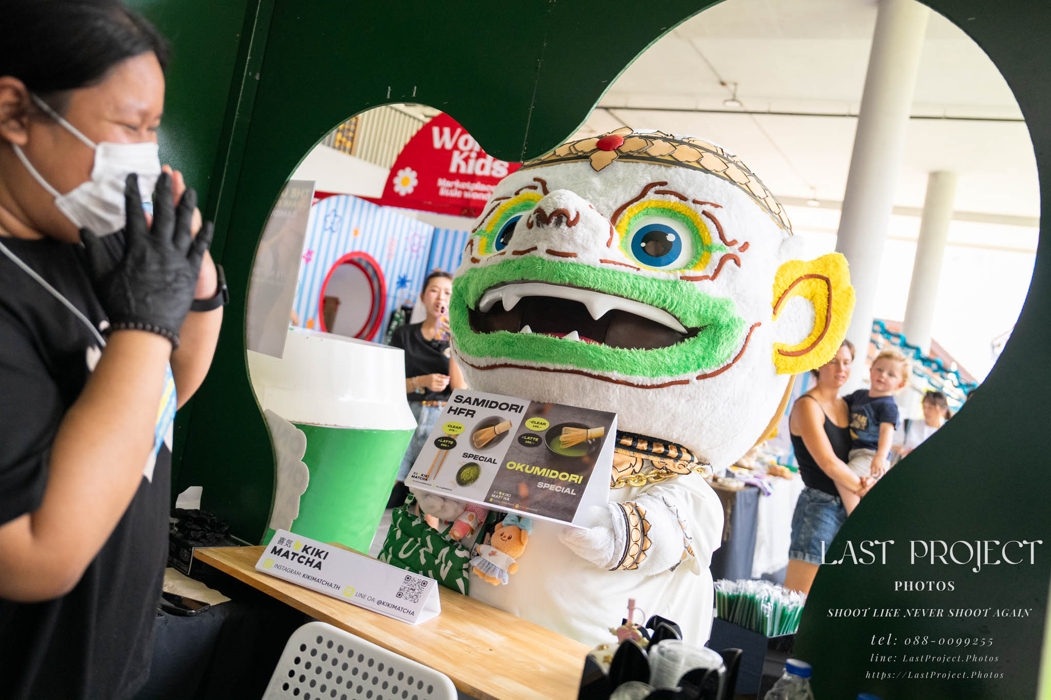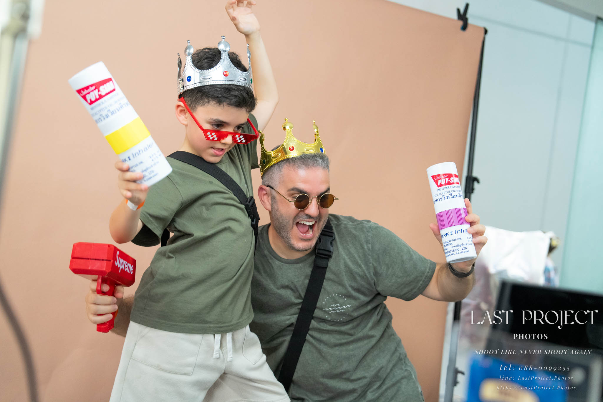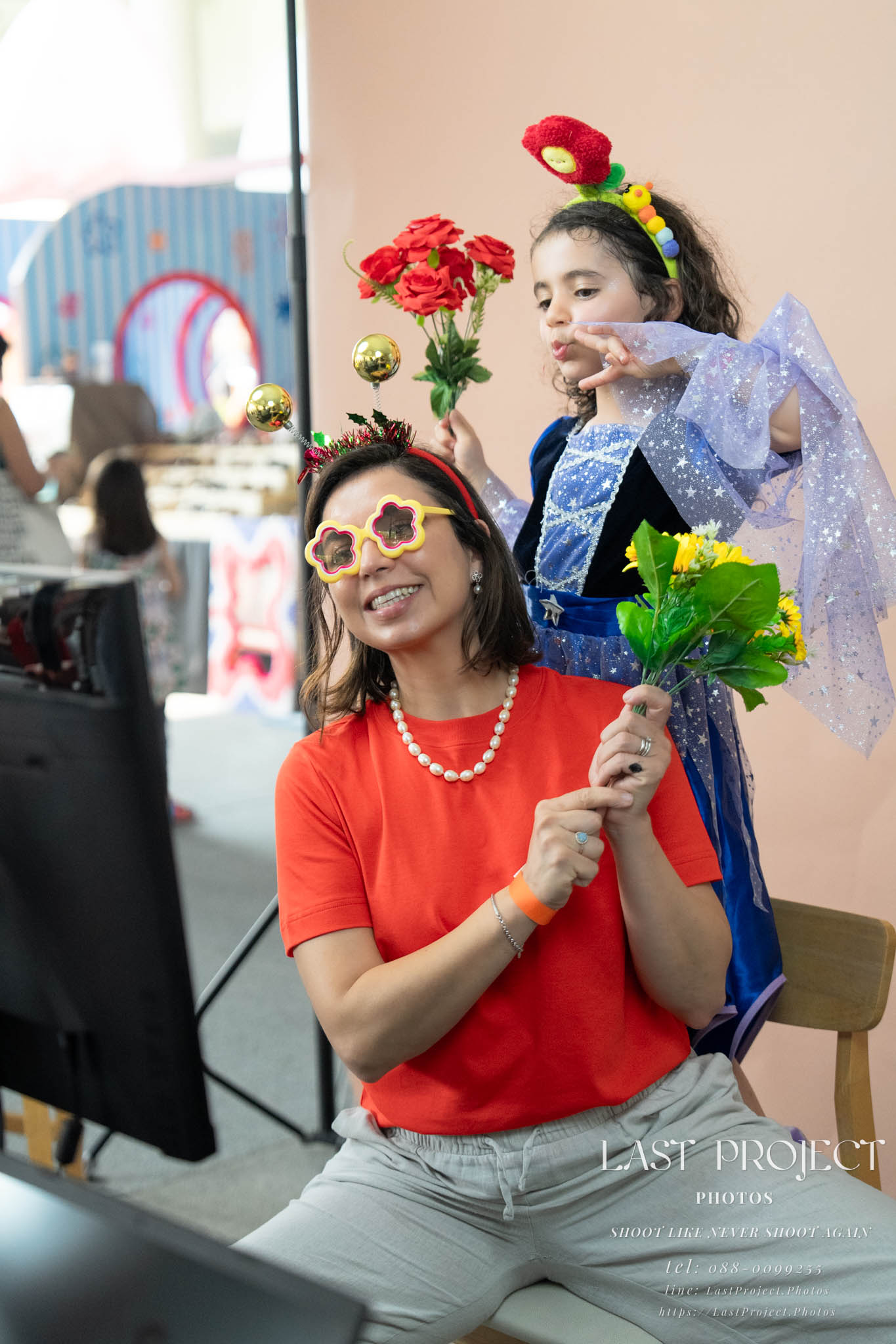 另一對母子在拍照區拍得很開心,有提供髮箍、眼鏡、花朵等道具可以配戴,想拍幾ท่าก็ได้ ถ่ายเสร็จก็能立刻拿照片,還可以用 QR 碼下載到手機。