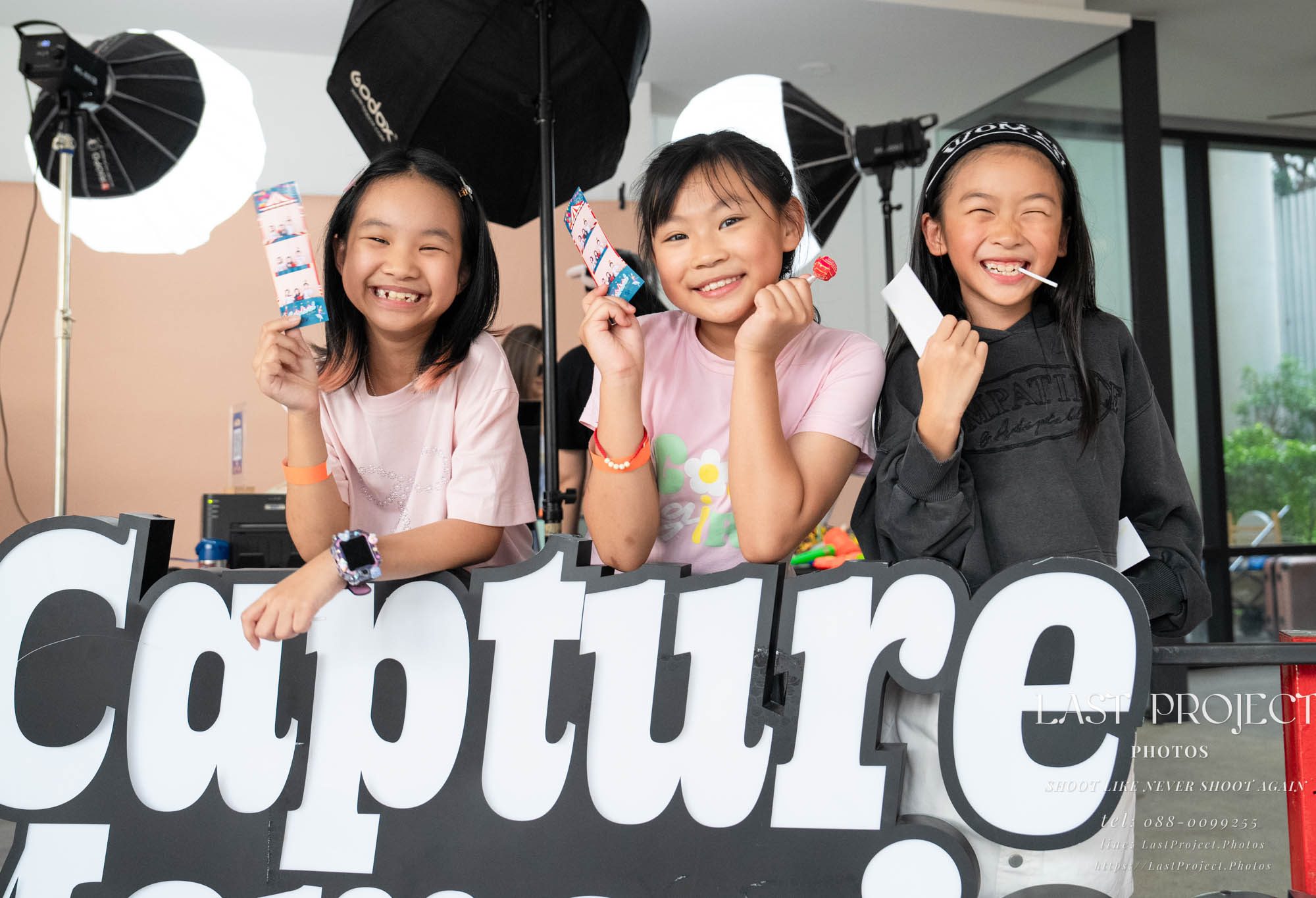 The kids happily showed off their printed photos after taking pictures at the photo booth, smiling joyfully in front of the booth.